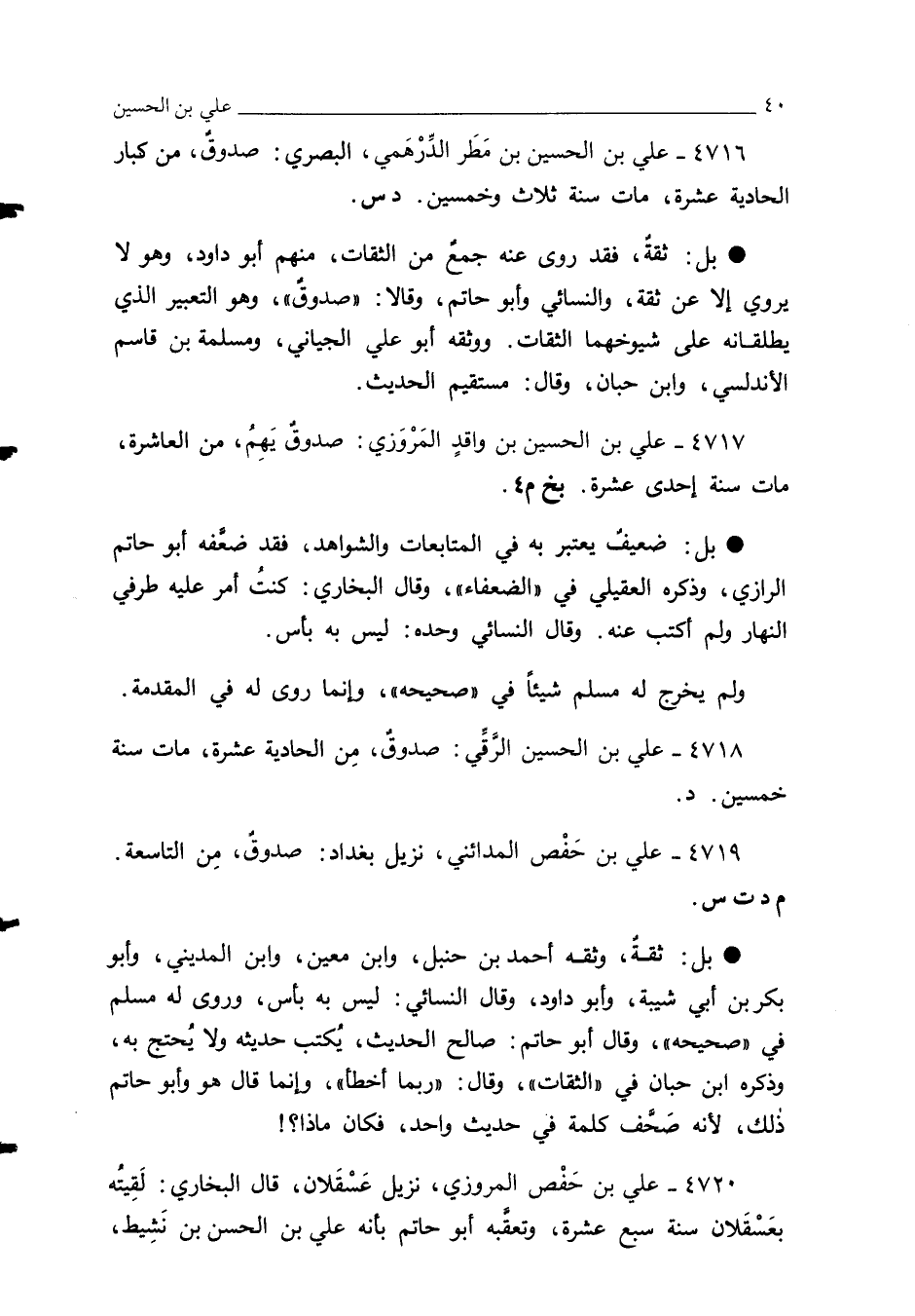 4717 - علي بن الحسين بن واقدٍ المَرْوَزي: صدوقٌ يَهِمُ، من العاشرة، مات سنة إحدى عشرة. بخ م 4.