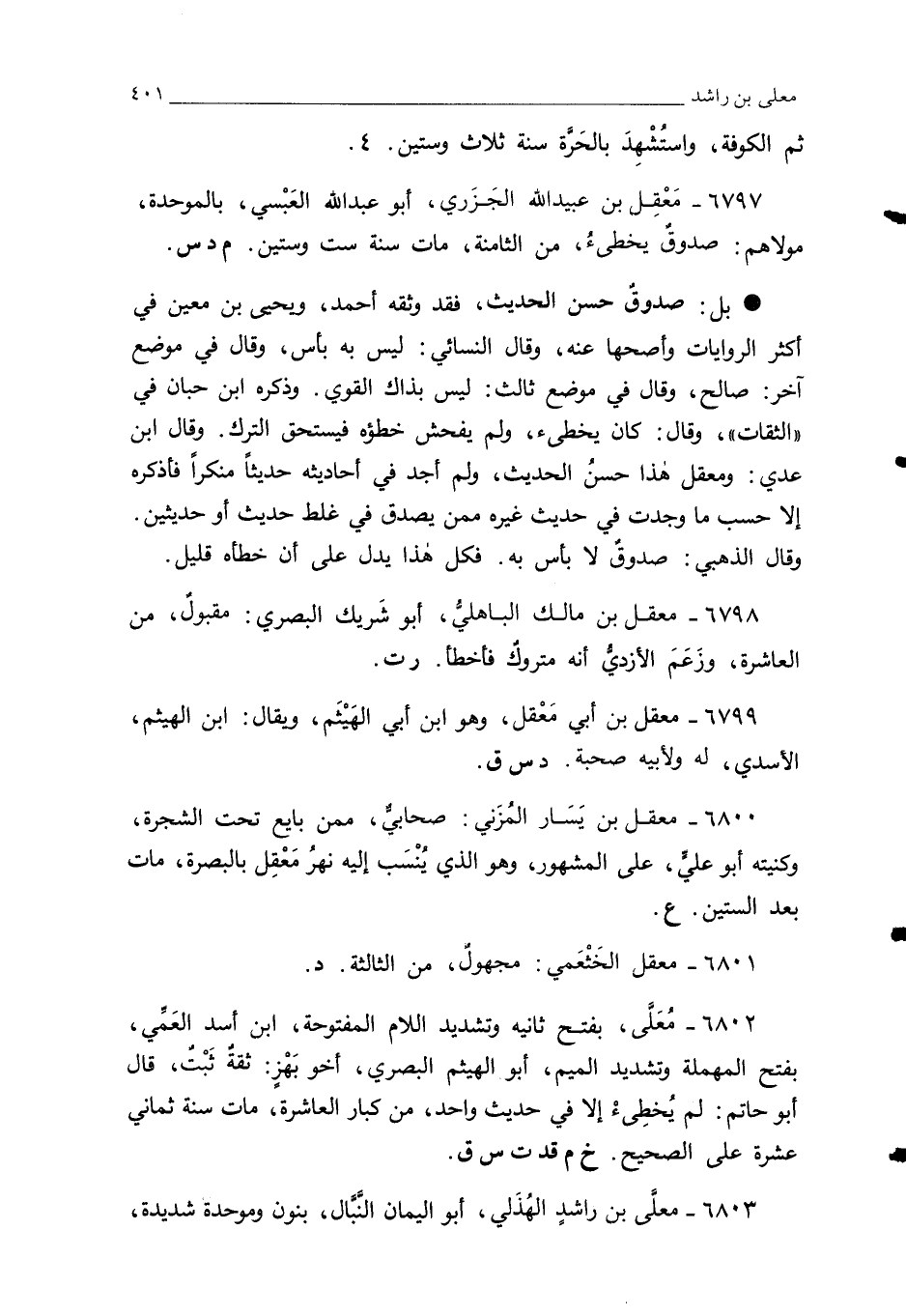 6797 - مَعْقِل بن عبيد الله الجَزَري، أبو عبد الله العَبْسي، بالموحدة، مولاهم: صدوقٌ يخطئُ، من الثامنة، مات سنة ست وستين. م د س.