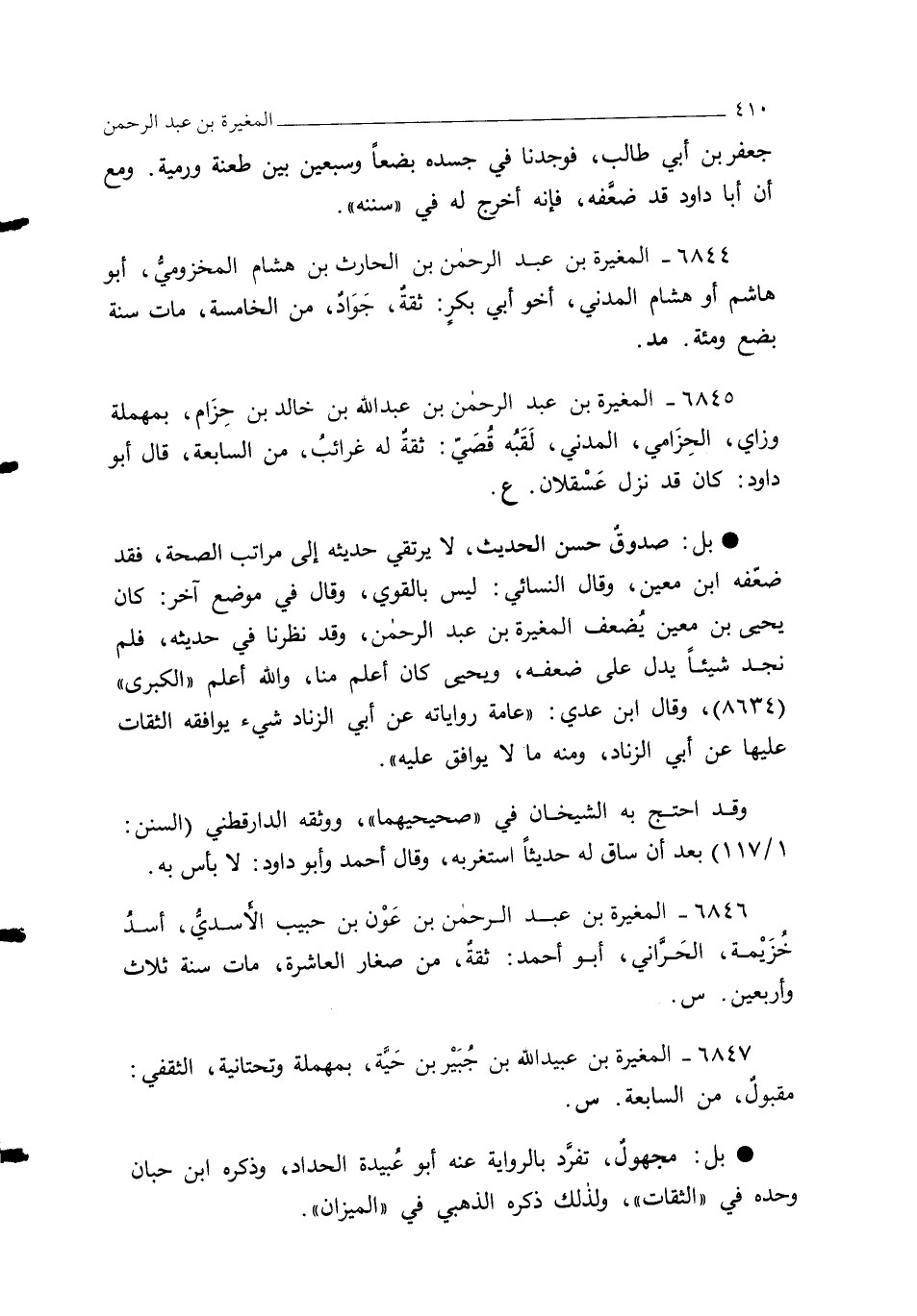 6844 - المغيرة بن عبد الرحمن بن الحارث بن هشام المخزوميُّ، أبو هاشم أو هشام المدني، أخو أبي بكرٍ: ثقةٌ، جَوَادٌ، من الخامسة، مات سنة بضع ومئة. مد.