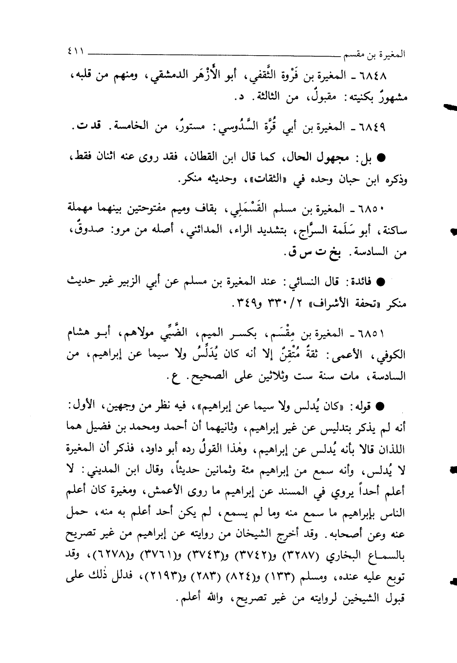 6851 - المغيرة بن مِقْسَم، بكسر الميم، الضَّبِّي مولاهم، أبو هشام الكوفي، الأعمى: ثقةٌ مُتْقِنٌ إلا أنه كان يُدَلَّسُ ولا سيما عن إبراهيم، من السادسة، مات سنة ست وثلاثين على الصحيح. ع.