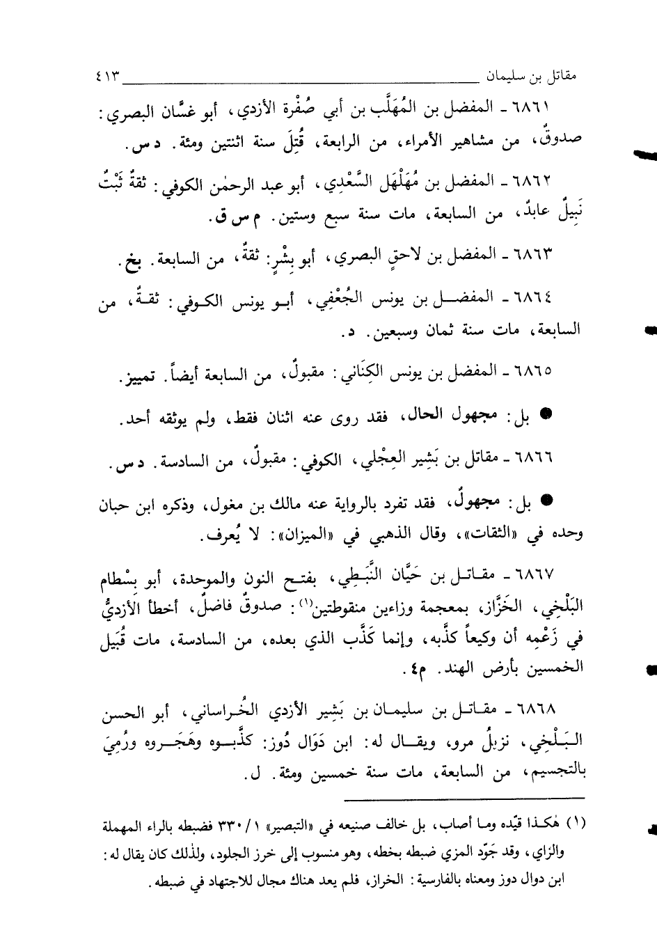 6868 - مقاتل بن سليمان بن بَشِير الأزدي الخُراساني، أبو الحسن البَلْخِي، نزيلُ مرو، ويقال له: ابن دَوَال دُوز: كذَّبوه وهَجَروه ورُمِيَ بالتجسيم، من السابعة، مات سنة خمسين ومئة. ل.