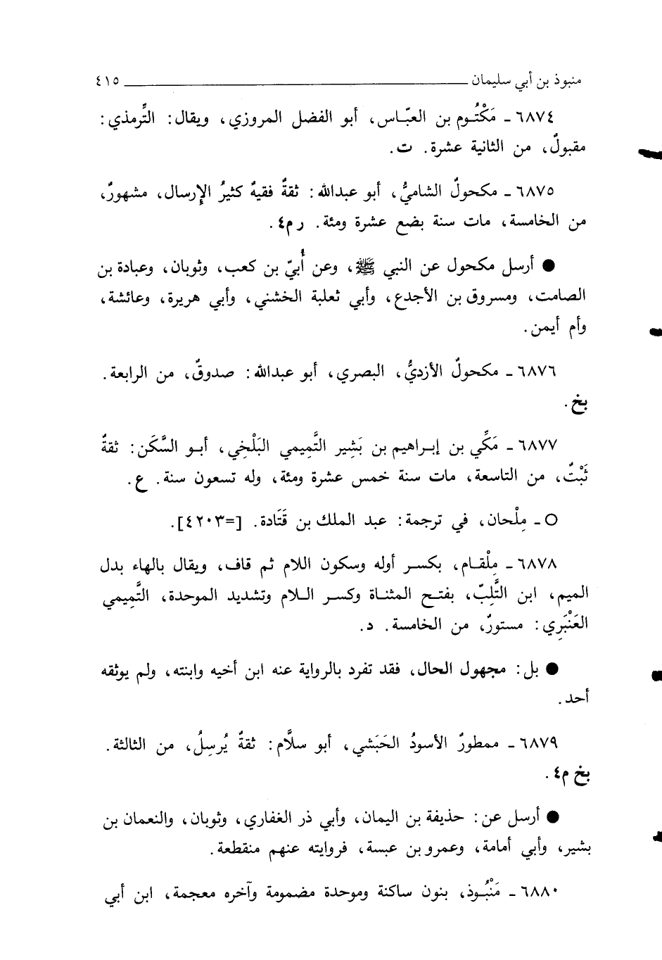 6875 - مكحولٌ الشاميُ، أبو عبد الله: ثقةٌ فقيهٌ كثيرُ الإِرسال، مشهورٌ، من الخامسة، مات سنة بضع عشرة ومئة. رم 4.