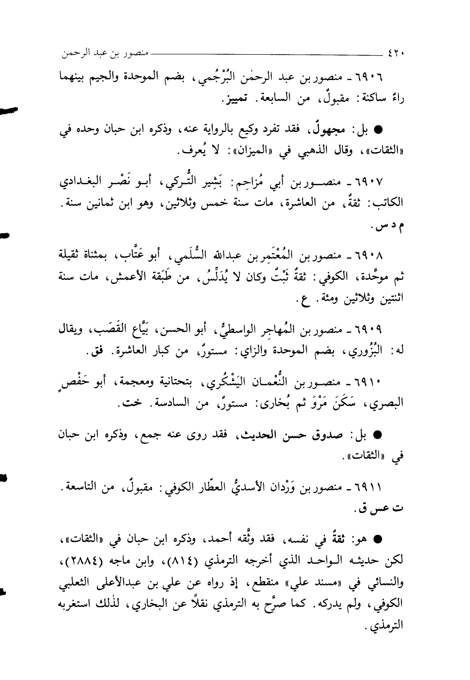 6906 - منصور بن عبد الرحمن البُرجُمي، بضم الموحدة والجيم بينهما راءٌ ساكنة: مقبولٌ، من السابعة. تمييز.