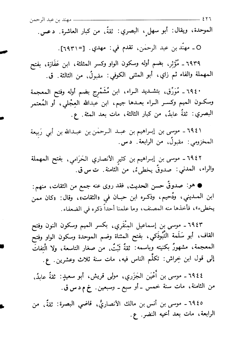 6939 - مُؤْثِر، بضم أوله وسكون الواو وكسر المثلثة، ابن عَفَازة، بفتح المهملة والفاء ثم زاي، أبو المثنى الكوفي: مقبولٌ، من الثالثة. ق.