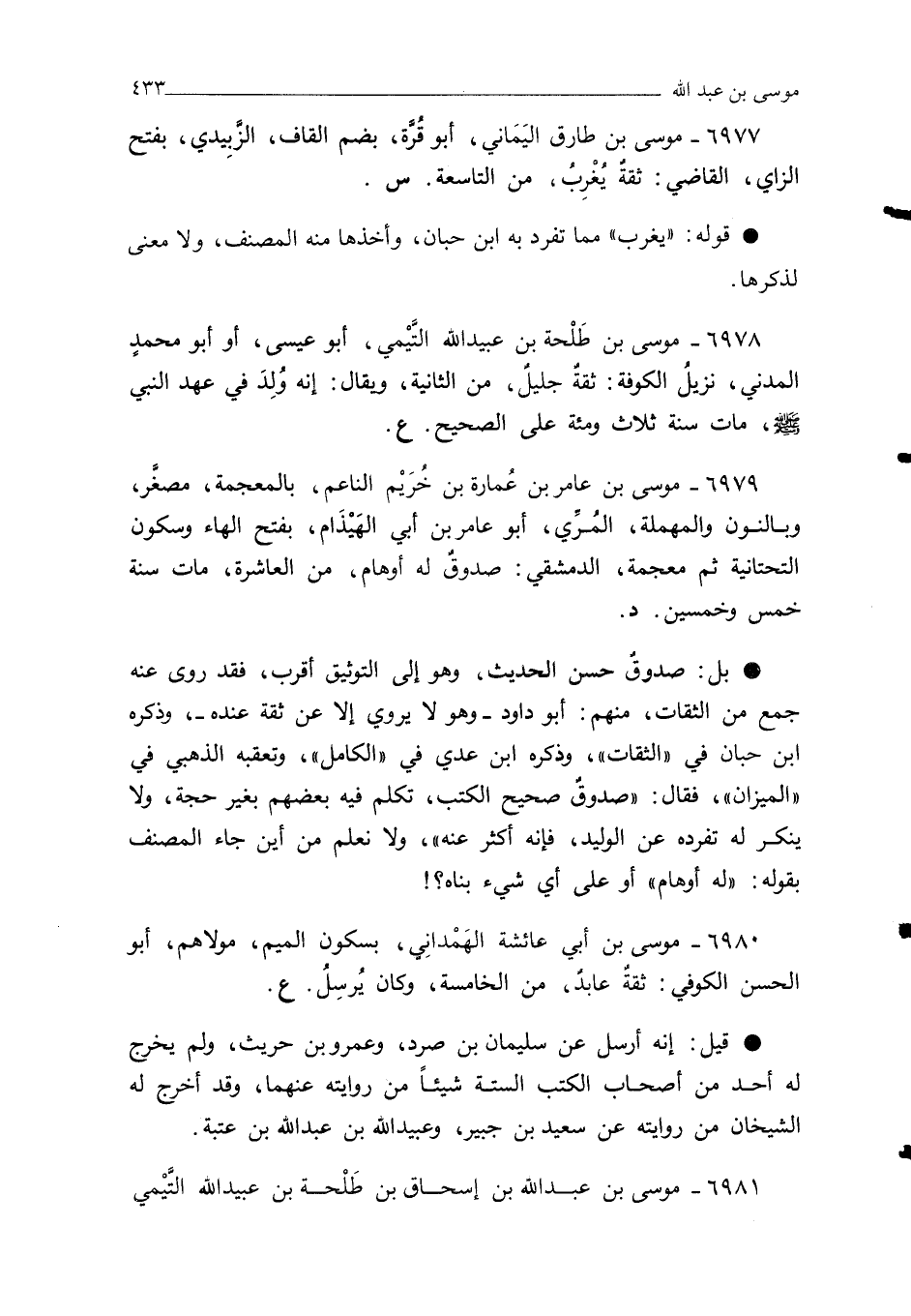 6980 - موسى بن أبي عائشة الهَمْدانِي، بسكون الميم، مولاهم، أبو الحسن الكوفي: ثقةٌ عابدٌ، من الخامسة، وكان يُرسِلُ. ع.