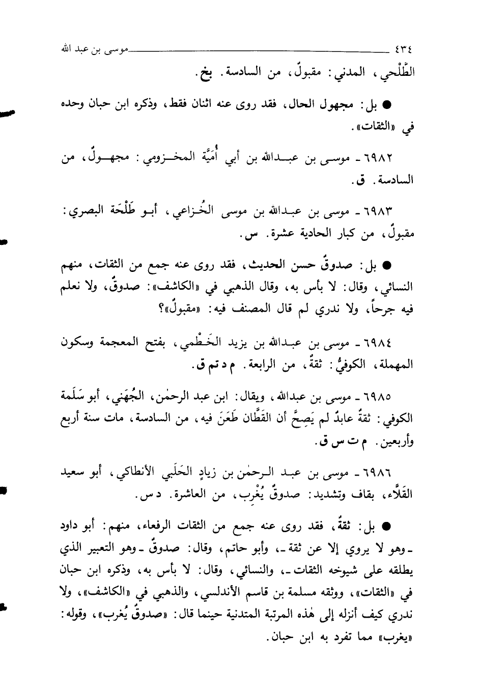 6986 - موسى بن عبد الرحمن بن زيادٍ الحَلَبي الأنطاكي، أبو سعيد القَلَّاء، بقاف وتشديد: صدوقٌ يُغرِب، من العاشرة. د س.