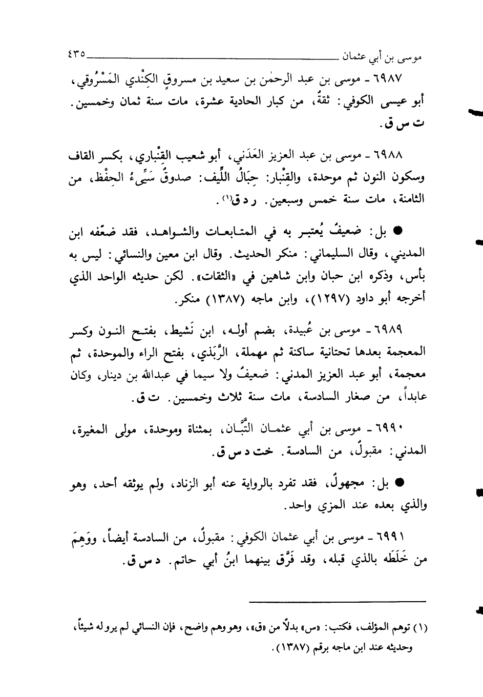 6991 - موسى بن أبي عثمان الكوفي: مقبولٌ، من السادسة أيضًا، ووَهِمَ من خَلَطَه بالذي قبله، وقد فَرَّق بينهما ابنُ أبي حاتم. د س ق.
