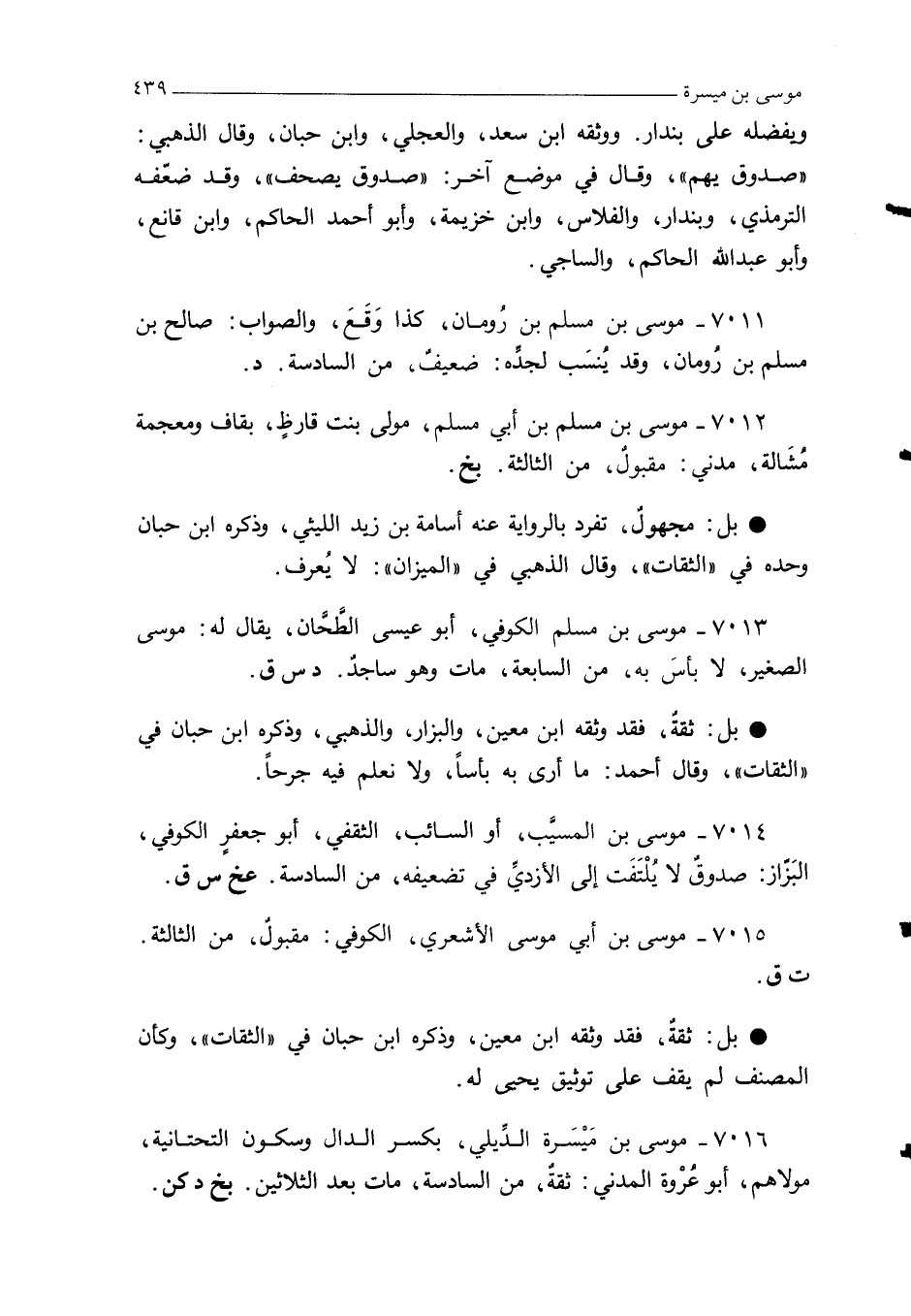 7016 - موسى بن مَيْسَرة الدِّيلي، بكسر الدال وسكون التحتانية، مولاهم، أبو عُرْوة المدني: ثقةٌ، من السادسة، مات بعد الثلاثين. بخ د كن.