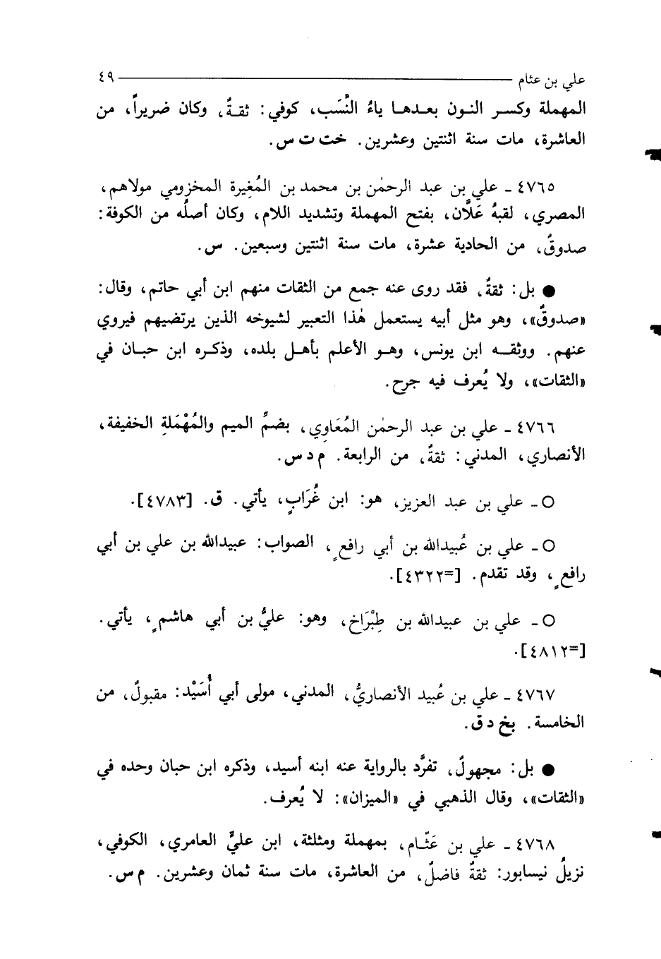 4768 - علي بن عَثّام، بمهملة ومثلثة، ابن عليٍّ العامري، الكوفي، نزيلُ نيسابور: ثقةٌ فاضلٌ، من العاشرة، مات سنة ثمان وعشرين. م س.