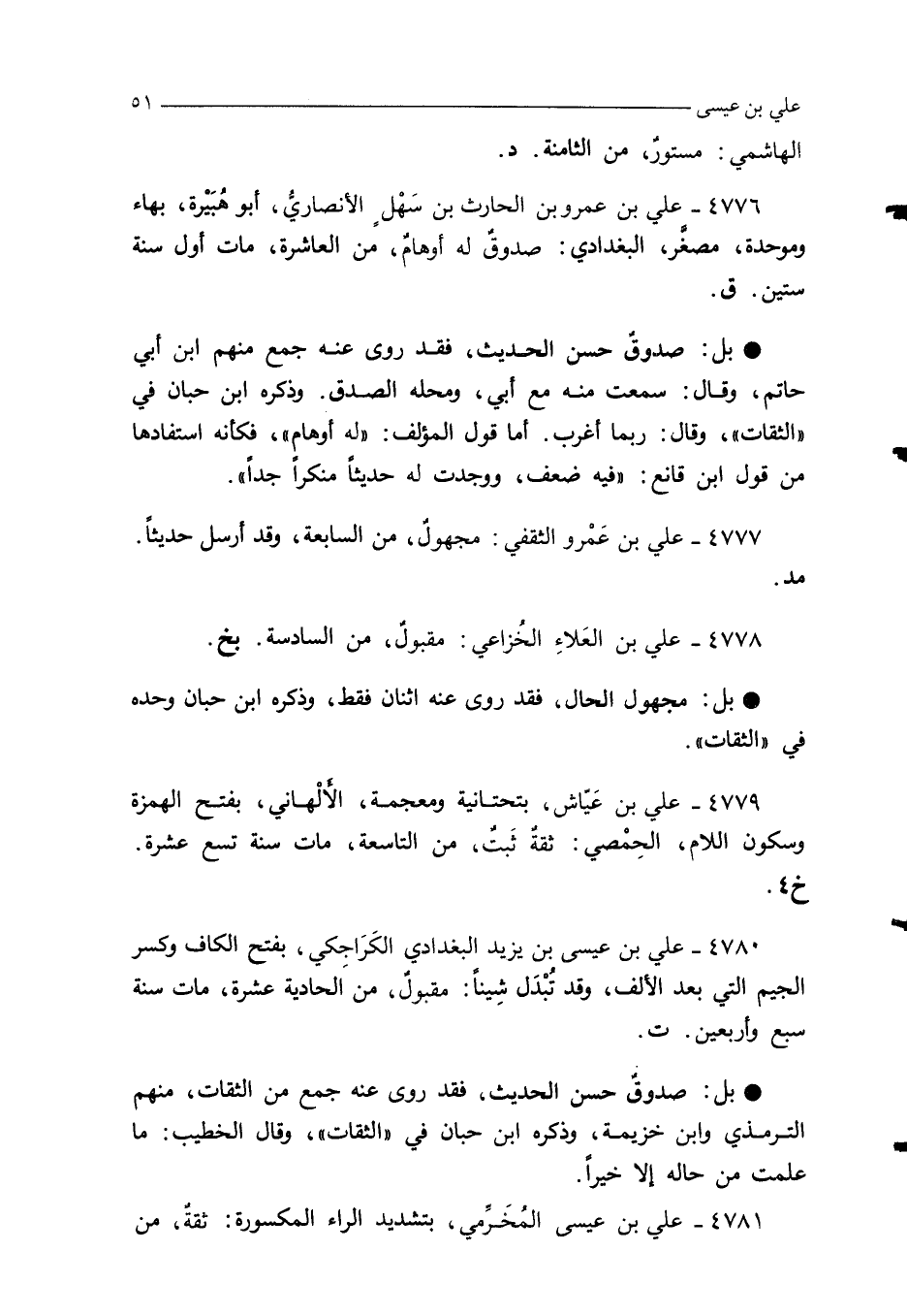 4780 - علي بن عيسى بن يزيد البغدادي الكَرَاجكي؛ بفتح الكاف وكسر الجيم التي بعد الألف، وقد تُبْدَل شِينًا: مقبولٌ، منَ الحادية عشرة، مات سنة سبع وأربعين. ت.