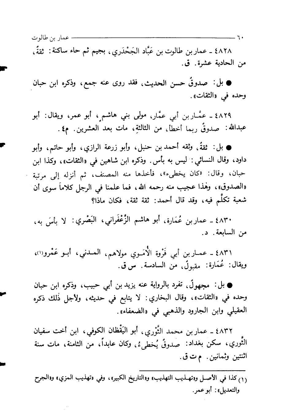 4828 - عمار بن طالوت بن عَبَّاد الجَحْدَري، بجيم ثم حاء ساكنة: ثقةٌ، من الحادية عشرة. ق.