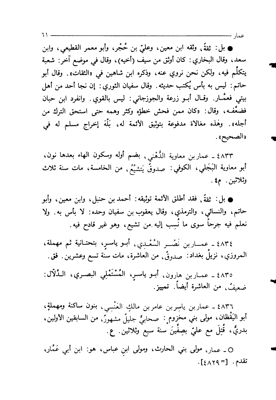 4833 - عمار بن معاوية الدُّهْني، بضم أوله وسكون الهاء بعدها نون، أبو معاوية البَجَلي، الكوفي: صدوق يَتشَيَّعُ، من الخامسة، مات سنة ثلاث وثلاثين. م 4.
