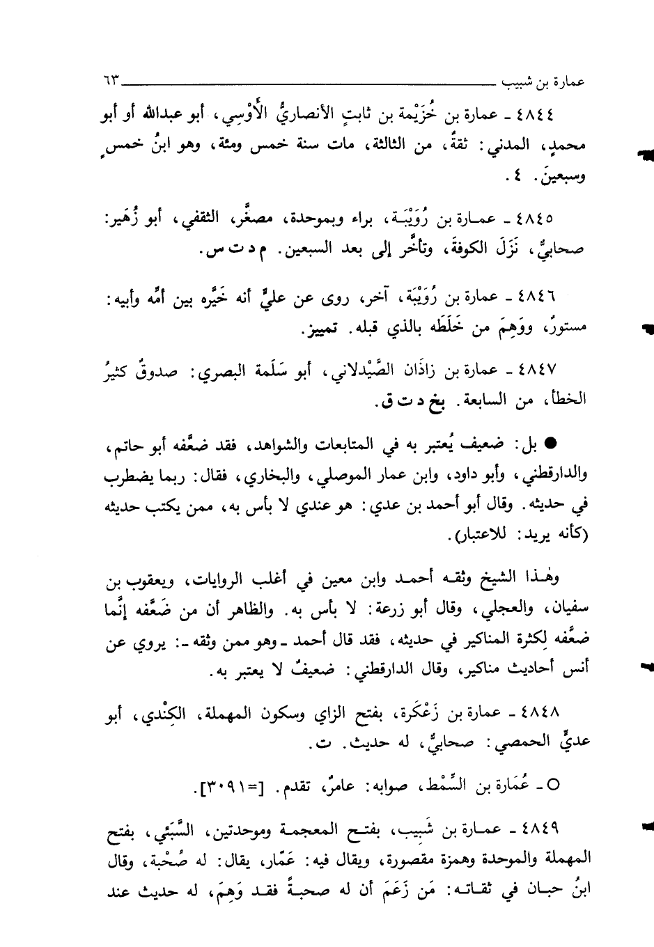 4844 - عمارة بن خُزَيْمة بن ثابتٍ الأنصاريُّ الأَوْسِي، . أبو عبد الله أو أبو محمدٍ، المدني: ثقةٌ، من الثالثة، مات سنة خمس ومئة، وهو ابنُ خمسٍ وسبعينَ.4.