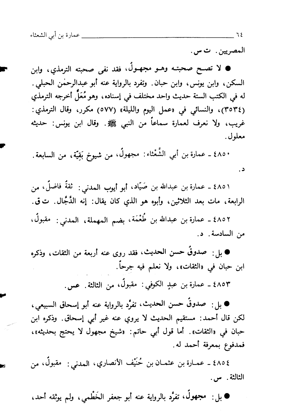 4850 - عمارة بن أبي الشَّعْثاء: مجهولٌ، من شيوخ بَقِيّة، من السابعة. د.