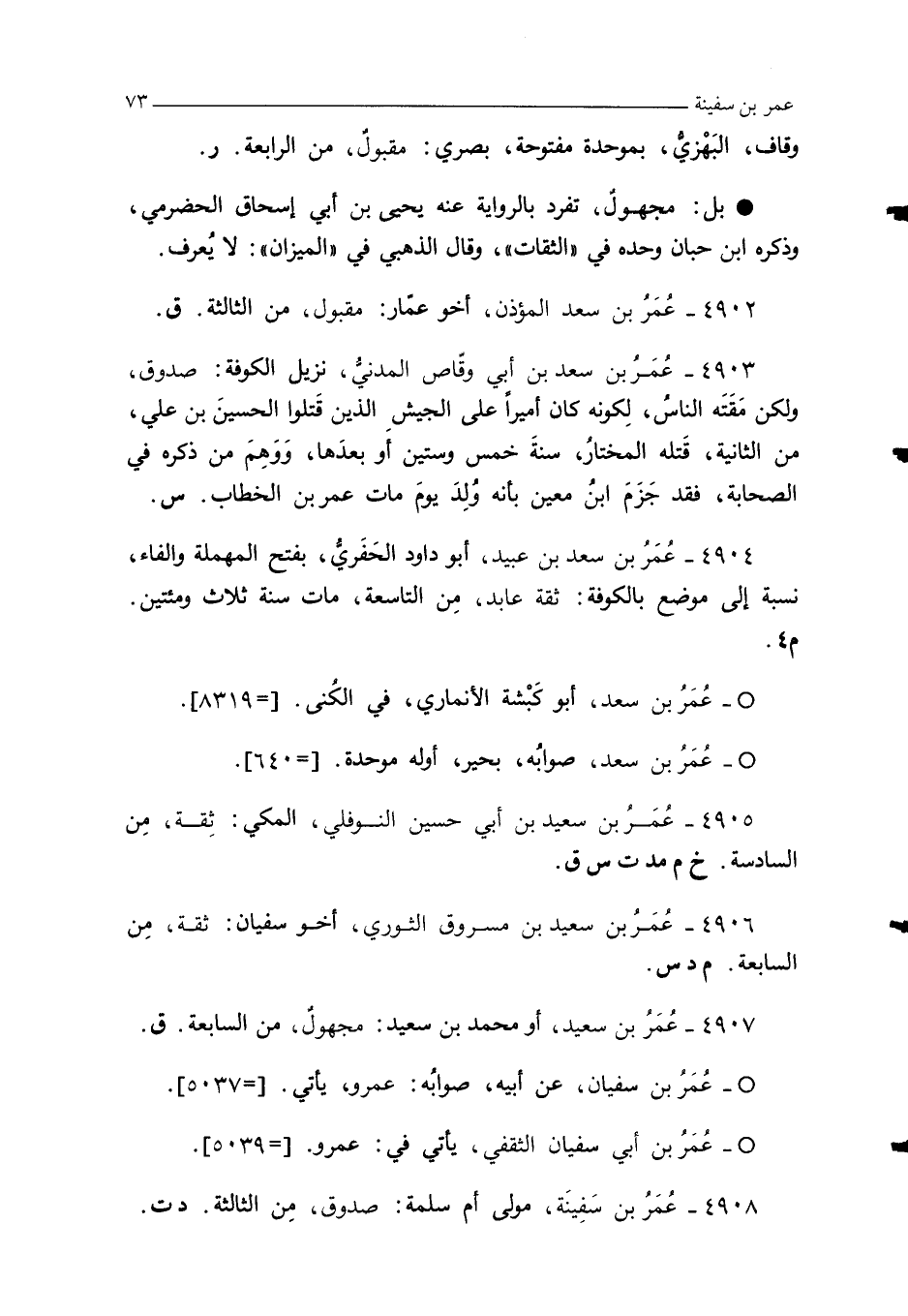 4907 - عُمَرُ بن سعيد، أو محمد بن سعيد: مجهولٌ، من السابعة. ق.