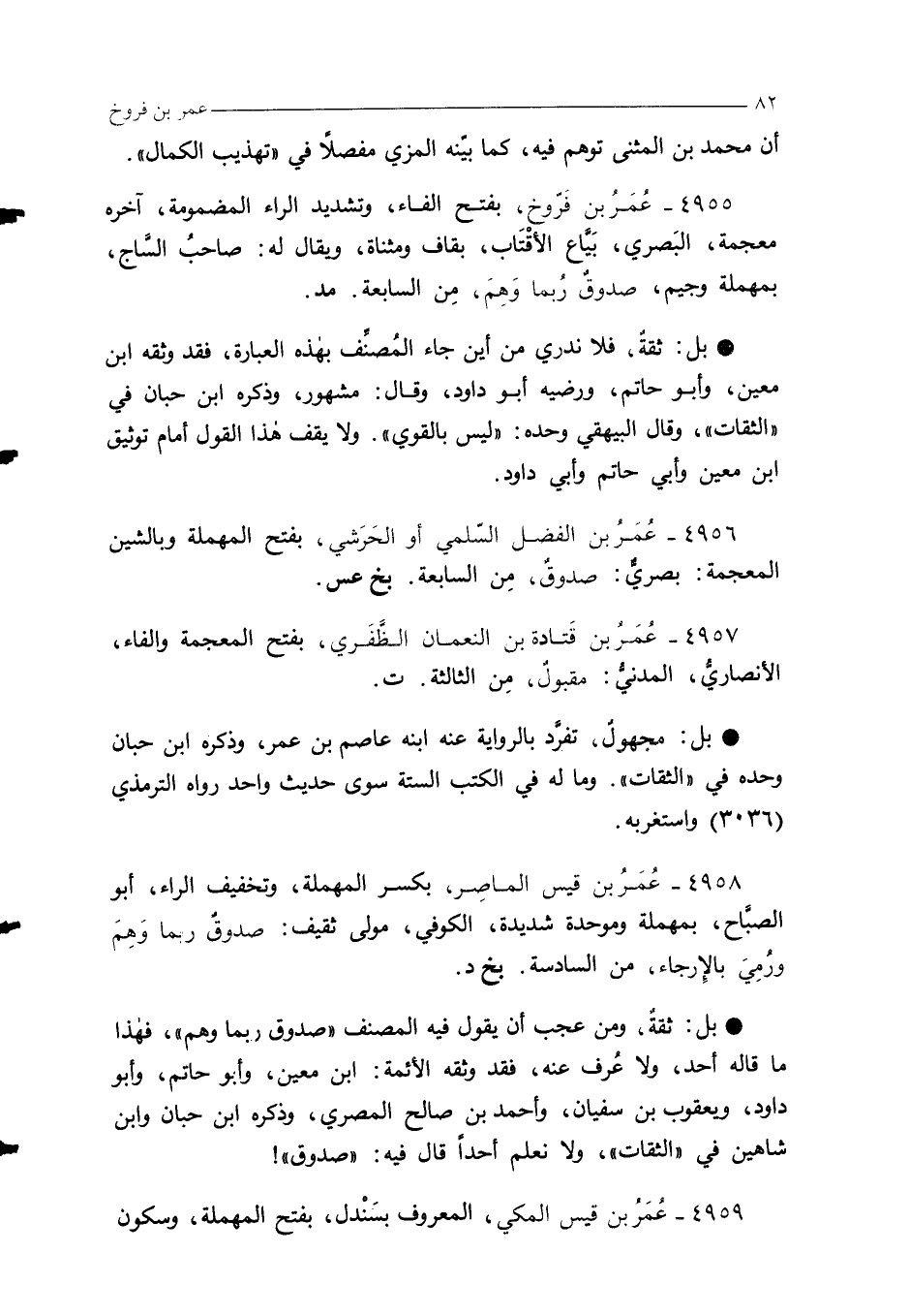 • بل: ثقةٌ، ومن عجب أن يقول فيه المصنف "صدوقٌ ربما وهم"، فهذا ما قاله أحد، ولا عُرف عنه، فقد وثقه الأئمة: ابن معين، وأبو حاتم، وأبو داود، ويعقوب بن سفيان، وأحمد بن صالح المصري، وذكره ابن حبان وابن شاهين في "الثقات"، ولا نعلم أحدًا قال فيه: "صدوق"!