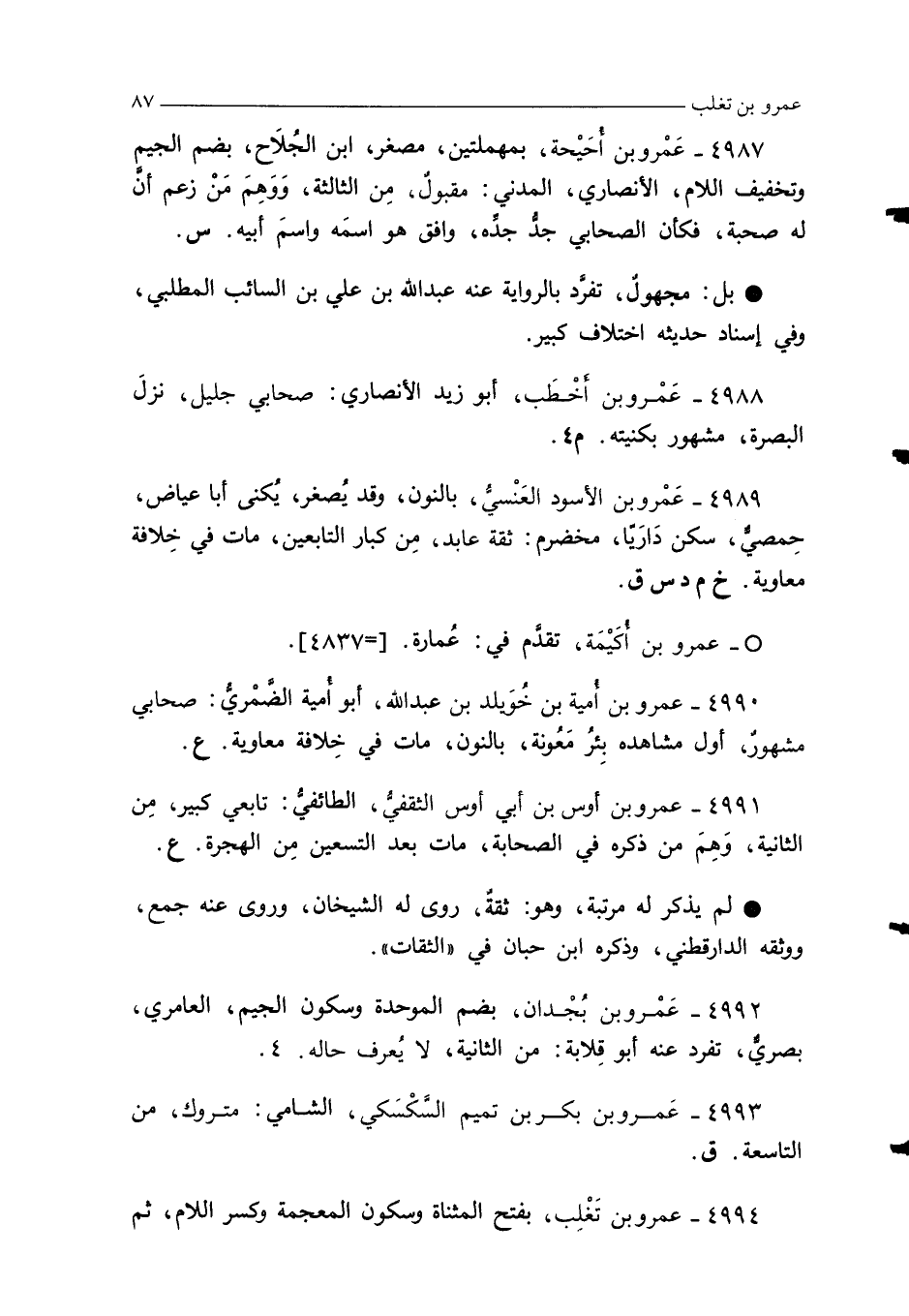 4988 - عَمْرو بن أَخْطَب، أبو زيد الأنصاري: صحابي جليل، نزلَ البصرة، مشهور بكنيته. م 4.