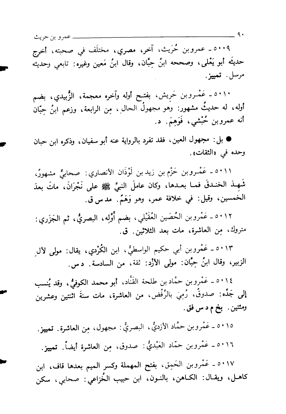 5009 - عمرو بن حُرَيث، آخر، مصري، مختلَف في صحبته، أخرج حديثَه أبو يَعْلى، وصححه ابنُ حِبَّان، وقال ابنُ مَعين وغيره: تابعي وحديثه مرسل. تمييز.