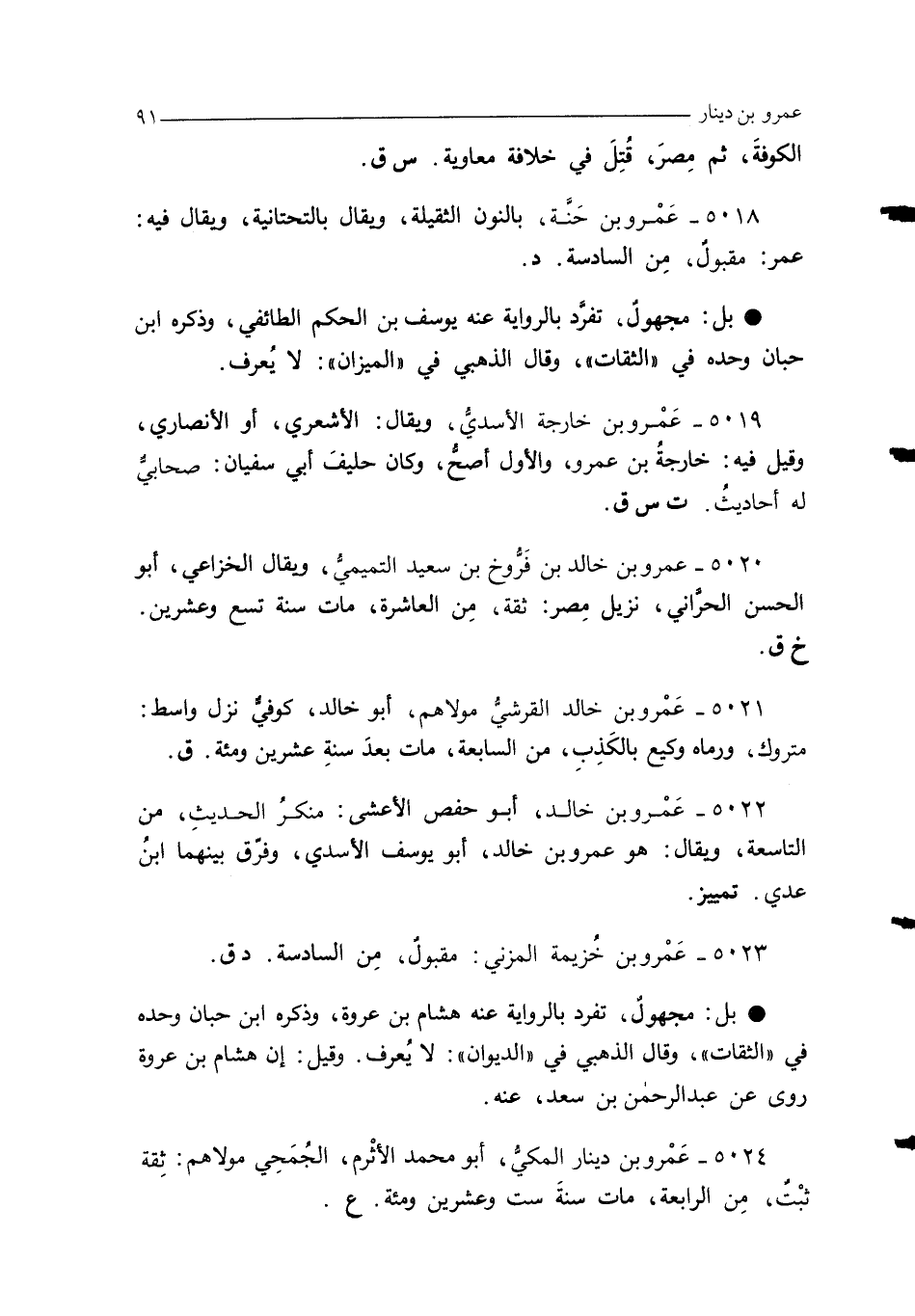 5020 - عمرو بن خالد بن فَرُّوخ بن سعيد التميميُّ، ويقال الخزاعي، أبو الحسن الحرَّاني، نزيل مِصر: ثقةٌ، مِن العاشرة، مات سنة تسع وعشرين. خ ق.