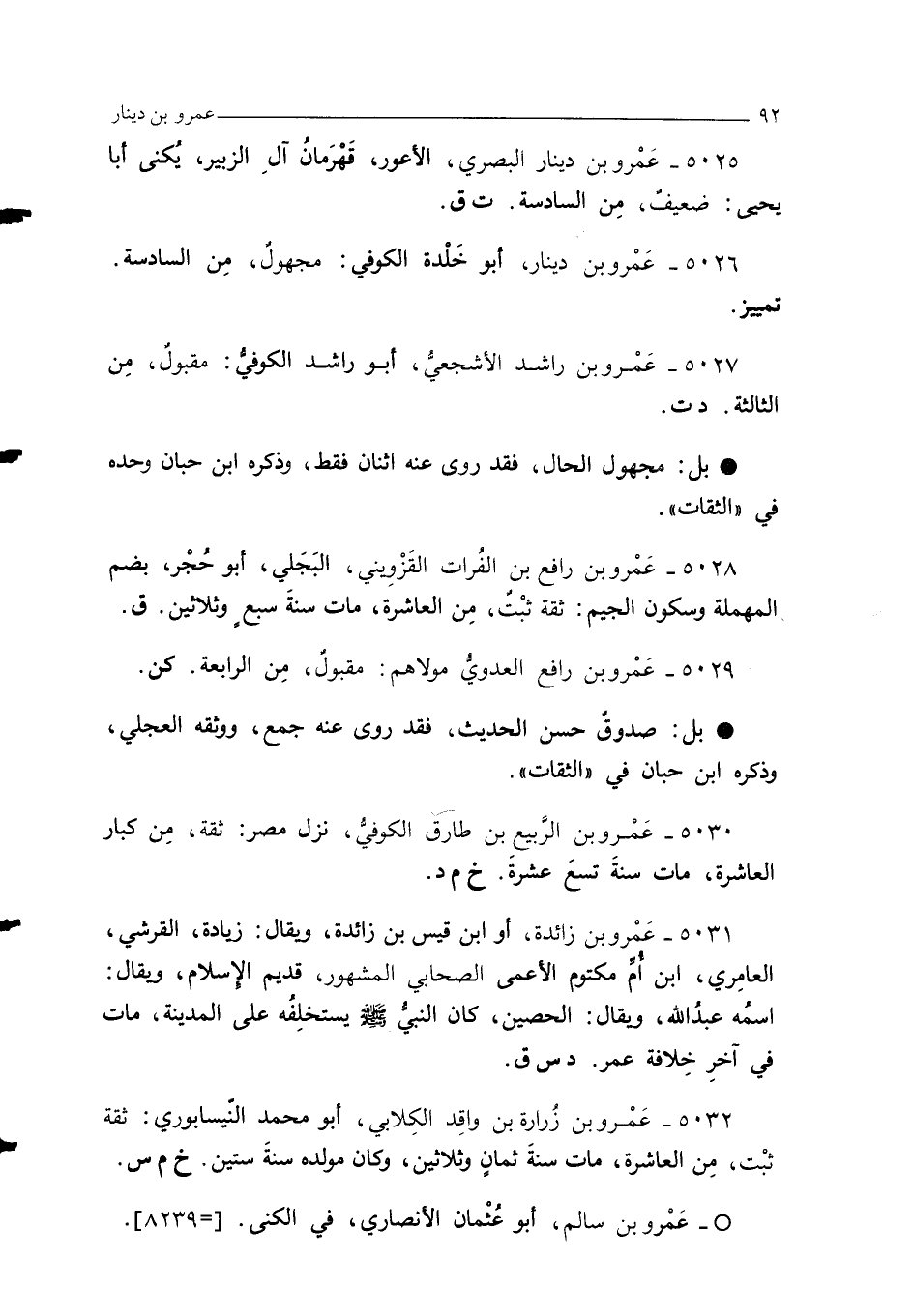 5028 - عَمْرو بن رافع بن الفُرات القَزوِيني، البَجَلي، أبو حُجْر، بضم المهملة وسكون الجيم: ثقةٌ ثبْتٌ، مِن العاشرة، مات سنةَ سبعٍ وثلاثين. ق.