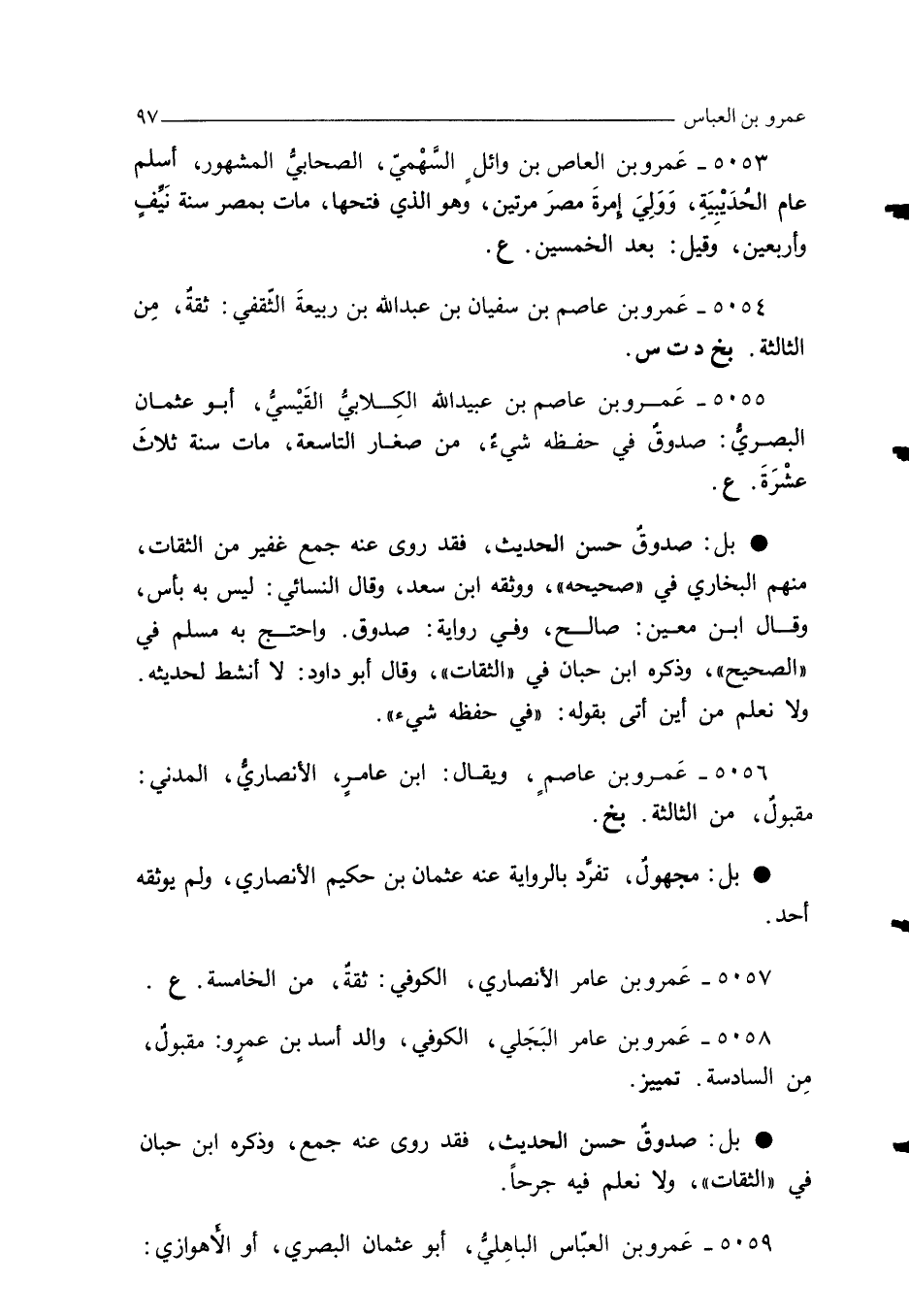 5058 - عَمرو بن عامر البَجَلي، الكوفيُّ، والد أسد بن عمرٍو: مقبولٌ، مِن السادسة. تمييز.