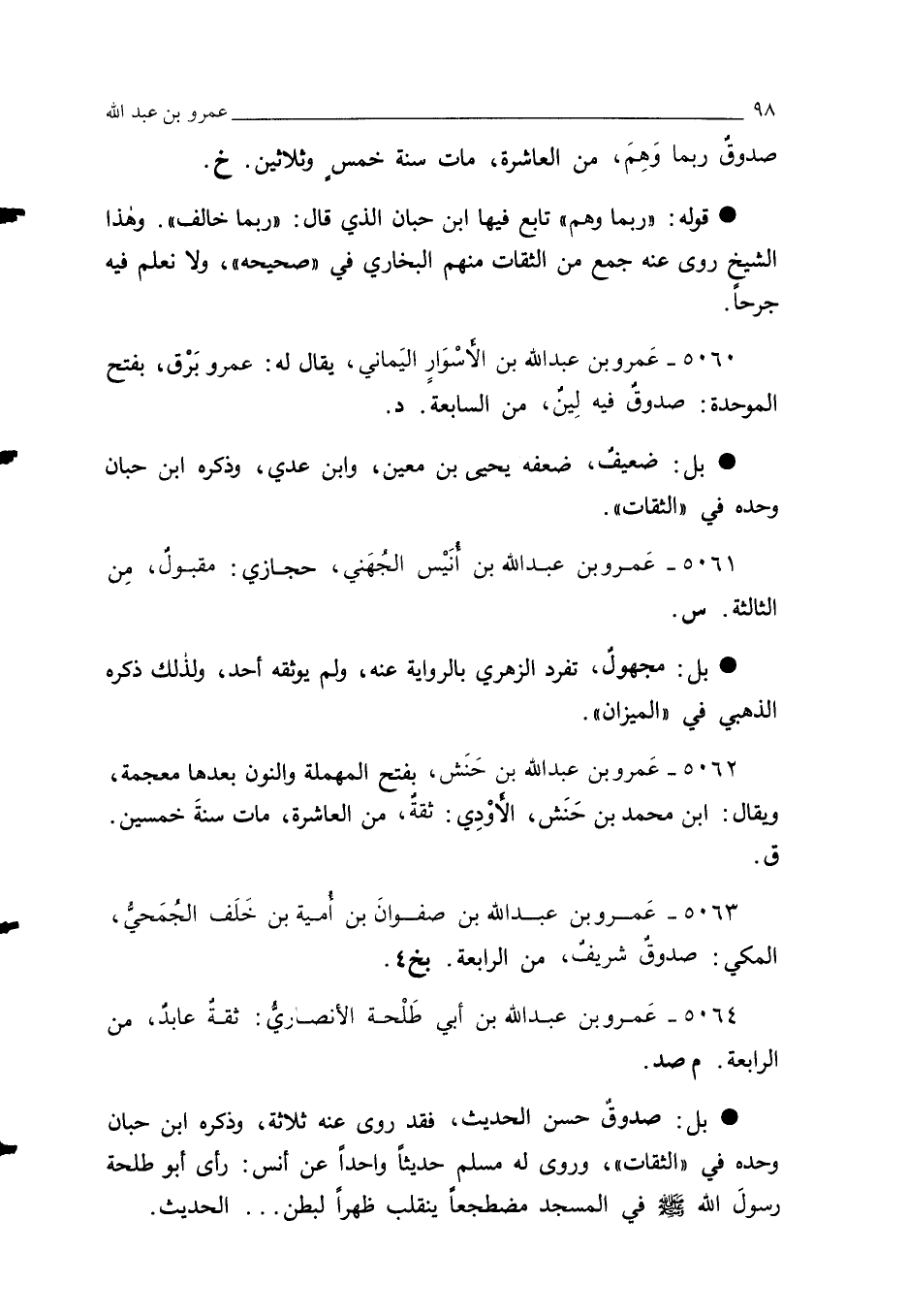 5063 - عَمرو بن عبد الله بن صفوانَ بن أُمية بن خَلَف الجُمَحيُّ، المكي: صدوقٌ شريفٌ، من الرابعة. بخ 4.