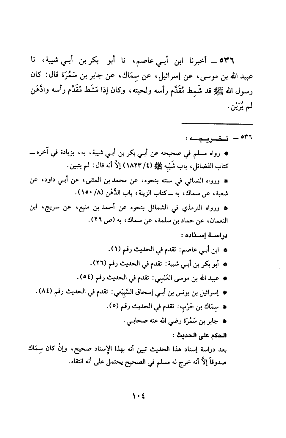 536 - أَخْبَرَنَا ابْنُ أَبِي عَاصِمٍ، نَا أَبُو بَكْرِ بْنُ أَبِي شَيْبَةَ، نَا عَبْيدُ اللَّهِ بْنُ مُوسَى، عَنْ إِسْرَائِيلَ، عَنْ سِمَاكٍ، عَنْ جَابِرِ بْنِ سَمُرَةَ، قَالَ: كَانَ رَسُولُ اللَّهِ صَلَّى اللهُ عَلَيْهِ وَسَلَّمَ §قَدْ شَمِطَ مُقَدِّمُ رَأْسِهِ وَلِحْيَتِهِ، فَكَانَ إِذَا مَشَطَ رَأْسَهُ وَادَّهَنَ لَمْ يُرَيْنَ