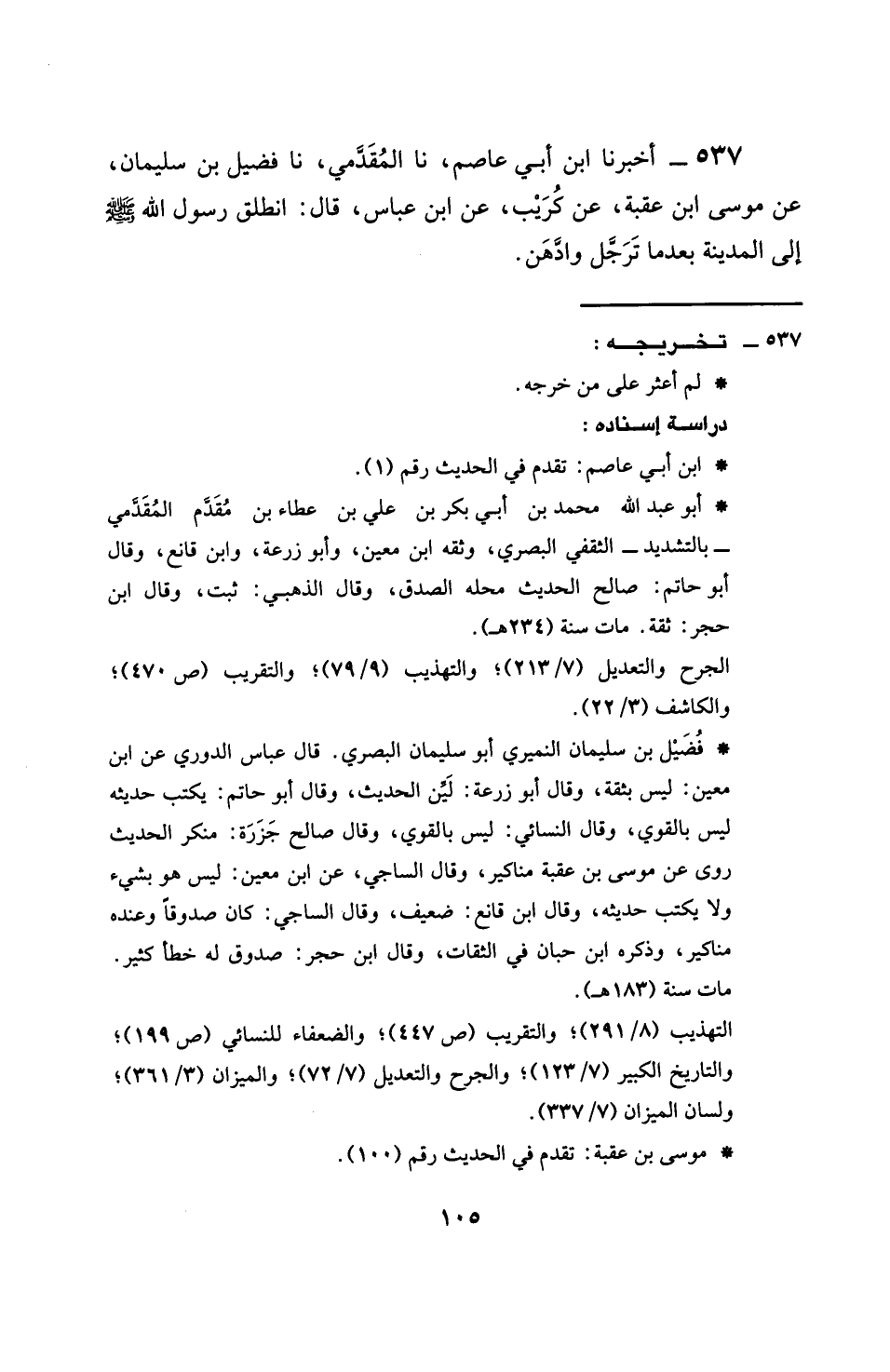 537 - أَخْبَرَنَا ابْنُ أَبِي عَاصِمٍ، نَا الْمُقَدَّمِيُّ، نَا فُضَيْلُ بْنُ سُلَيْمَانَ، عَنْ مُوسَى بْنِ عُقْبَةَ، عَنْ كُرَيْبٍ، عَنِ ابْنِ عَبَّاسٍ، قَالَ: §انْطَلَقَ رَسُولُ اللَّهِ صَلَّى اللهُ عَلَيْهِ وَسَلَّمَ إِلَى الْمَدِينَةِ، بَعْدَمَا تَرَجَّلَ وَادَّهَنَ