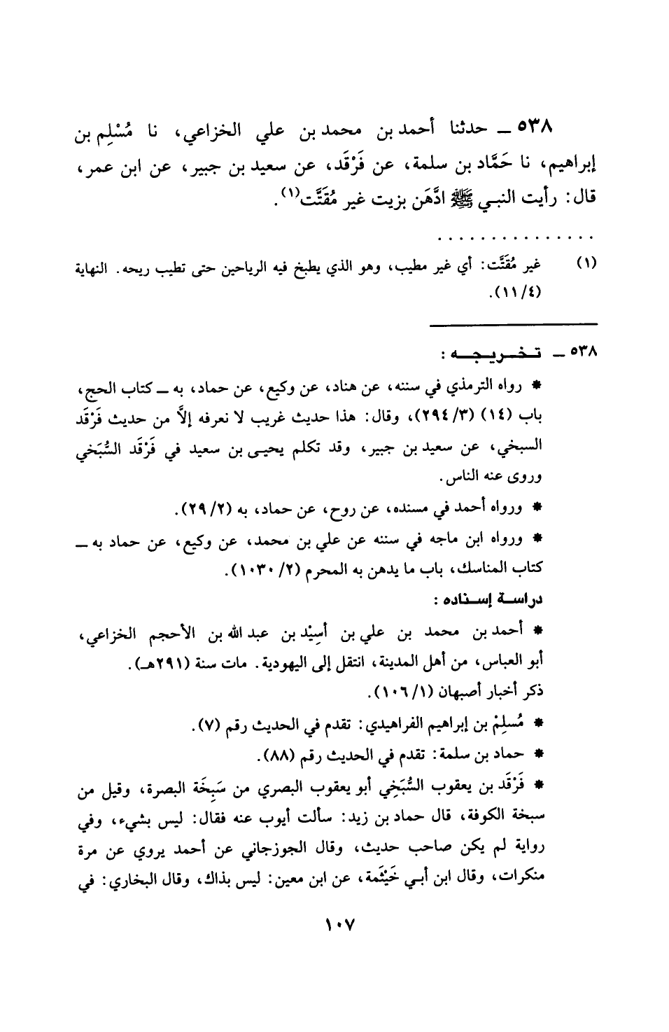 538 - حَدَّثَنَا أَحْمَدُ بْنُ مُحَمَّدِ بْنِ عَلِيٍّ الْخُزَاعِيُّ، نَا مُسْلِمُ بْنُ إِبْرَاهِيمَ، نَا حَمَّادُ بْنُ سَلَمَةَ، عَنْ فَرْقَدٍ، عَنْ سَعِيدِ بْنِ جُبَيْرٍ، عَنِ ابْنِ عُمَرَ، قَالَ: §رَأَيْتُ النَّبِيَّ صَلَّى اللهُ عَلَيْهِ وَسَلَّمَ ادَّهَنَ بِزَيْتٍ غَيْرِ مُقَتَّتٍ
