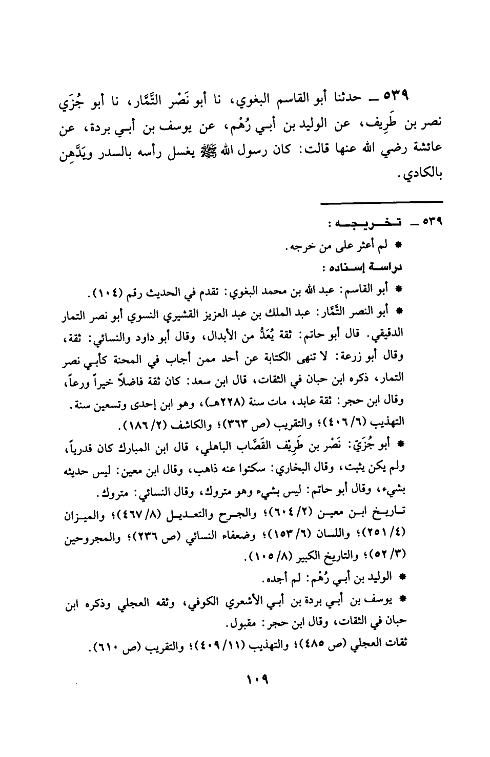 539 - حَدَّثَنَا أَبُو الْقَاسِمِ الْبَغَوِيِّ، نَا أَبُو نَصْرٍ التَّمَّارُ، نَا أَبُو جُزَيٍّ نَصْرُ بْنُ طَرِيفٍ، عَنِ الْوَلِيدِ بْنِ أَبِي رَهْمٍ، عَنْ يُوسُفَ بْنِ أَبِي بُرْدَةَ، عَنْ عَائِشَةَ، رَضِيَ اللَّهُ عَنْهَا، قَالَتْ: كَانَ رَسُولُ اللَّهِ صَلَّى اللهُ عَلَيْهِ وَسَلَّمَ §يَغْسِلُ رَأْسَهُ بِالسِّدْرِ وَيَدَّهِنُ بِالْكَاذِي