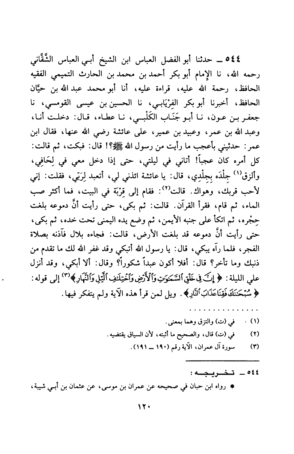 544 - حَدَّثَنَا أَبُو الْفَضْلِ الْعَبَّاسُ ابْنُ الشَّيْخِ أَبِي الْعَبَّاسِ السَّقَانِيُّ رَحِمَهُ اللَّهُ، نا الْإِمَامُ أَبُو بَكْرٍ أَحْمَدُ بْنُ مُحَمَّدِ بْنِ الْحَارِثِ التَّمِيمِيُّ الْفَقِيهُ الْحَافِظُ رَحْمَةُ اللَّهِ عَلَيْهِ، قِرَاءَةً عَلَيْهِ أنا أَبُو مُحَمَّدٍ عَبْدُ اللَّهِ بْنُ مُحَمَّدِ بْنِ حَيَّانَ الْحَافِظُ، أَخْبَرَنَا أَبُو بَكْرٍ الْفِرْيَابِيُّ، نَا الْحُسَيْنُ بْنُ عِيسَى الْقُومَسِيُّ، نَا جَعْفَرُ بْنُ عَوْنٍ، نَا أَبُو جَنَابٍ الْكَلْبِيُّ، نَا عَطَاءٌ، قَالَ: §دَخَلْتُ أَنَا وَعَبْدُ اللَّهِ بْنُ عُمَرَ، وَعُبَيْدُ بْنُ عُمَيْرٍ، عَلَى عَائِشَةَ رَضِيَ اللَّهُ عَنْهَا، فَقَالَ ابْنُ عُمَرَ: حَدِّثِينِي بِأَعْجَبَ مَا رَأَيْتِ مِنَ رَسُولُ اللَّهِ صَلَّى اللهُ عَلَيْهِ وَسَلَّمَ؟ قَالَ: فَبَكَتْ، ثُمَّ قَالَتْ: كُلُّ أَمِرِهِ كَانَ عَجَبًا أَتَانِي فِي لَيْلَتِي، حَتَّى إِذَا دَخَلَ مِعِي فِي لِحَافِي، وَأَلْزَقَ جِلْدَهُ بِجِلْدِي، قَالَ: يَا عَائِشَةُ ائْذَنِي لِي، أَتَعَبَّدُ لِرَبِّي، فَقُلْتُ: إِنِّي لَأُحِبُّ قُرْبَكَ وَهَوَاكَ قَالَتْ: فَقَامَ إِلَى قِرْبَةٍ فِي الْبَيْتِ، فَمَا أَكْثَرَ صَبَّ الْمَاءِ، ثُمَّ قَامَ فَقَرَأَ الْقُرْآنَ قَالَتْ: ثُمَّ بَكَى، حَتَّى رَأَيْتُ أَنَّ دُمُوعَهُ بَلَغَتْ حِجْرَهُ، ثُمَّ اتَّكَأَ عَلَى جَنْبِهِ الْأَيْمَنِ، ثُمَّ وَضَعَ يَدَهُ الْيُمْنَى تَحْتَ خَدِّهِ، ثُمَّ بَكَى، حَتَّى رَأَيْتُ أَنَّ دُمُوعَهُ قَدْ بَلَغَتِ الْأَرْضَ قَالَتْ: فَجَاءَ بِلَالٌ فَآذَنَهُ بِصَلَاةِ الْفَجْرِ، فَلَمَّا رَأَهْ يَبْكِي، قَالَ: يَا رَسُولَ اللَّهِ أَتَبْكِي وَقَدْ غَفَرَ اللَّهُ لَكَ مَا تَقَدَّمَ مِنْ ذَنْبِكَ وَمَا تَأَخَّرَ؟ قَالَ: أَفَلَا أَكُونُ عَبْدًا شَكُورًا؟ وَقَالَ: أَلَا أَبْكِي وَقَدْ أُنْزِلَ عَلَيَّ اللَّيْلَةَ: {إِنَّ فِي خَلْقِ السَّمَوَاتِ وَالْأَرْضِ وَاخْتِلَافِ اللَّيْلِ وَالنَّهَارِ} إِلَى قَوْلِهِ {سُبْحَانَكَ فَقِنَا عَذَابَ النَّارِ} [آل عمران: 191] وَيْلٌ لِمَنْ قَرَأَ هَذِهِ الْآيَةَ وَلَمْ يَتَفَكَّرْ فِيهَا