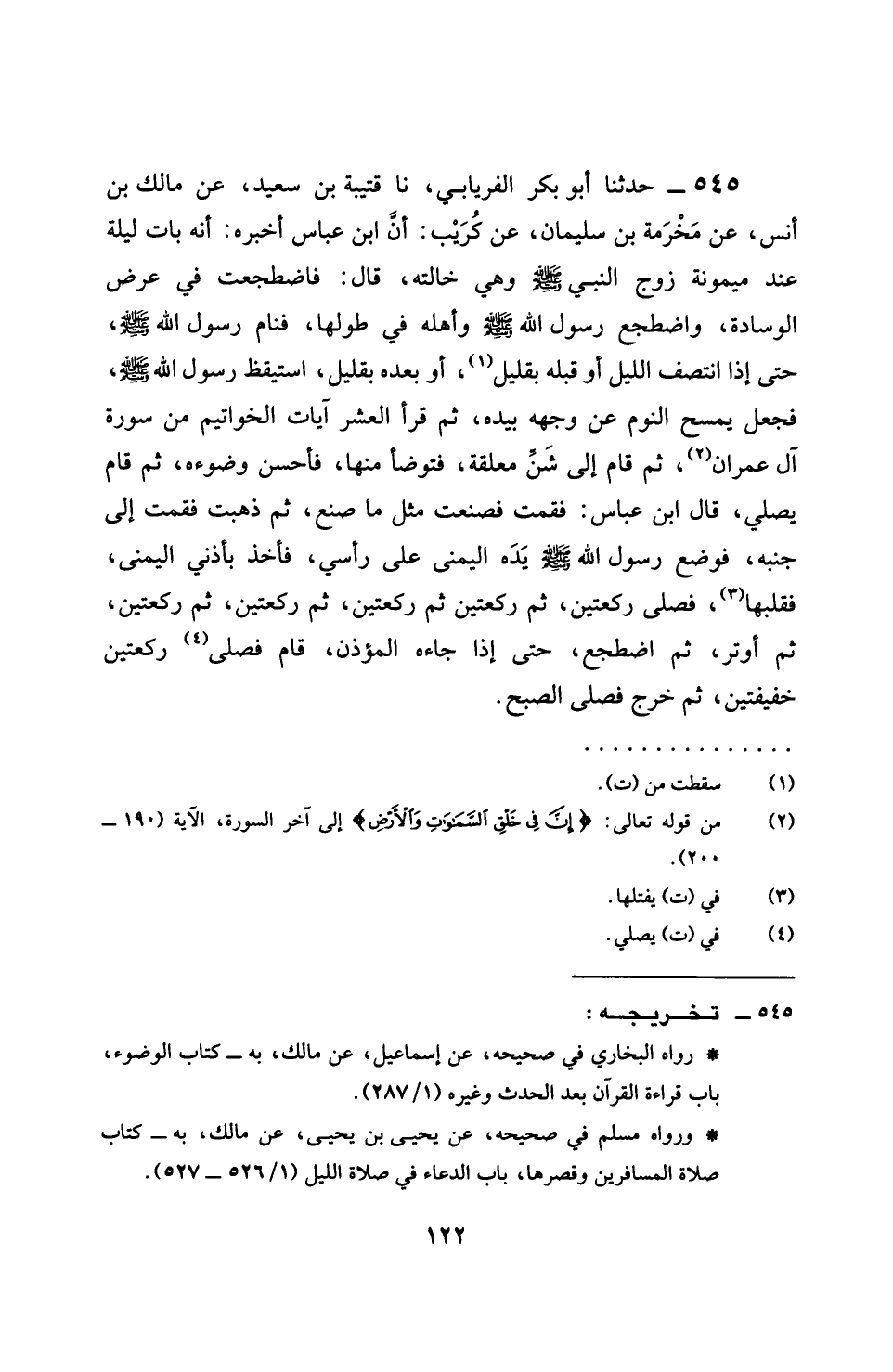545 - حَدَّثَنَا أَبُو بَكْرٍ الْفِرْيَابِيُّ، نَا قُتَيْبَةُ بْنُ سَعِيدٍ، عَنْ مَالِكِ بْنِ أَنَسٍ، عَنْ مَخْرَمَةَ بْنِ سُلَيْمَانَ، عَنْ كُرَيْبٍ، أَنَّ ابْنَ عَبَّاسٍ أَخْبَرَهُ أَنَّهُ §بَاتَ لَيْلَةً عِنْدَ مَيْمُونَةَ زَوْجِ النَّبِيِّ صَلَّى اللهُ عَلَيْهِ وَسَلَّمَ، وَهَيَ خَالَتُهُ قَالَ: فَاضْطَجَعْتُ فِي عَرْضِ الْوِسَادَةِ، وَاضْطَجَعَ رَسُولُ اللَّهِ صَلَّى اللهُ عَلَيْهِ وَسَلَّمَ وَأَهْلُهُ فِي طُولِهَا، فَنَامَ رَسُولُ اللَّهِ صَلَّى اللهُ عَلَيْهِ وَسَلَّمَ، حَتَّى إِذَا انْتَصَفَ اللَّيْلُ، أَوْ قَبْلَهُ بِقَلِيلٍ أَوْ بَعْدَهُ بِقَلِيلٍ، اسْتَيْقَظَ رَسُولُ اللَّهِ صَلَّى اللهُ عَلَيْهِ وَسَلَّمَ، فَجَعَلَ يَمْسَحُ النَّوْمَ عَنْ وَجْهِهِ بِيَدِهِ، ثُمَّ قَرَأَ الْعَشْرَ آيَاتٍ الْخَوَاتِيمَ مِنْ سُورَةِ آلَ عِمْرَانَ، ثُمَّ قَامَ إِلَى شَنٍّ مُعَلَّقَةٍ، فَتَوَضَّأَ مِنْهَا، فَأَحْسَنَ وُضُوءَهُ، ثُمَّ قَامَ يُصَلِّي، قَالَ ابْنُ عَبَّاسٍ: فَقُمْتُ فَصَنَعْتُ مِثْلَ مَا صَنَعَ، ثُمَّ ذَهَبْتُ فَقُمْتُ إِلَى جَنْبِهِ، فَوَضَعَ رَسُولُ اللَّهِ صَلَّى اللهُ عَلَيْهِ وَسَلَّمَ يَدَهُ الْيُمْنَى عَلَى رَأْسِي، فَأَخَذَ بِأُذُنِي الْيُمْنَى، فَقَلَّبَهَا، فَصَلَّى رَكْعَتَيْنِ، ثُمَّ رَكْعَتَيْنِ، ثُمَّ رَكْعَتَيْنِ، ثُمَّ رَكْعَتَيْنِ، ثُمَّ رَكْعَتَيْنِ، ثُمَّ أَوْتَرَ، ثُمَّ اضْطَجَعَ، حَتَّى إِذَا جَاءَهُ الْمُؤَذِّنُ، قَامَ فَصَلَّى رَكْعَتَيْنِ خَفِيفَتَيْنِ، ثُمَّ خَرَجَ فَصَلَّى الصُّبْحَ