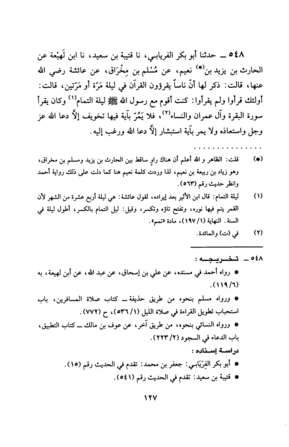 548 - حَدَّثَنَا أَبُو بَكْرٍ الْفِرْيَابِيُّ، نَا قُتَيْبَةُ بْنُ سَعِيدٍ، نَا ابْنُ لَهِيعَةَ، عَنِ الْحَارِثِ بْنِ يَزِيدَ، عَنِ ابْنِ نُعَيْمٍ، عَنْ مُسْلِمِ بْنِ مِخْرَاقٍ، عَنْ عَائِشَةَ، رَضِيَ اللَّهُ عَنْهَا، قَالَتْ: ذُكِرَ لَهَا أَنَّ نَاسًا يَقْرَءُونَ الْقُرْآنَ فِي لَيْلَةٍ مَرَّةً، أَوْ مَرَّتَيْنِ، قَالَتْ: أُولَئِكَ قَرَءُوا، وَلَمْ يَقْرَءُوا، §كُنْتُ أَقُومُ مَعَ رَسُولُ اللَّهِ صَلَّى اللهُ عَلَيْهِ وَسَلَّمَ لَيْلَةَ التَّمَامِ، وَكَانَ يَقْرَأُ سُورَةَ الْبَقَرَةِ، وَآلَ عِمْرَانَ، وَالنِّسَاءَ، فَلَا يَمُرُّ بِآيَةٍ فِيهَا تَخْوِيفٌ إِلَّا دَعَا اللَّهَ عَزَّ وَجَلَّ وَاسْتَعَاذَهُ، وَلَا يَمُرُّ بِآيَةِ اسْتِبْشَارٍ إِلَّا دَعَا اللَّهَ وَرَغِبَ إِلَيْهِ