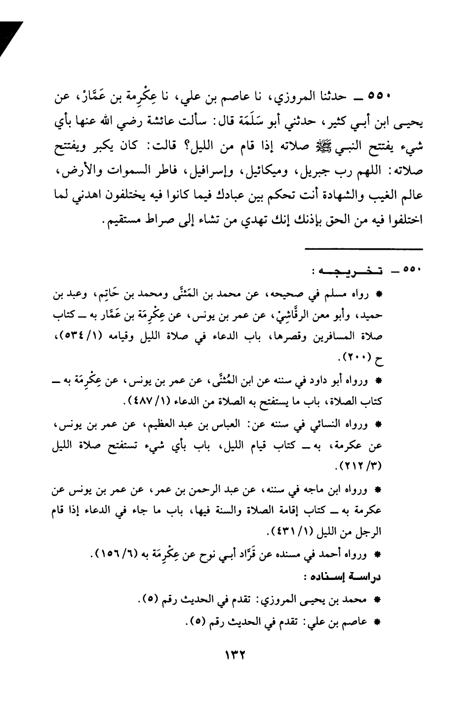 550 - حَدَّثَنَا الْمَرْوَزِيُّ، نَا عَاصِمُ بْنُ عَلِيٍّ، نَا عِكْرِمَةُ بْنُ عَمَّارٍ، عَنْ يَحْيَى بْنِ أَبِي كَثِيرٍ، حَدَّثَنِي أَبُو سَلَمَةَ، قَالَ: سَأَلْتُ عَائِشَةَ رَضِيَ اللَّهُ عَنْهَا: بِأَيِّ شَيْءٍ كَانَ يَفْتَتِحُ النَّبِيُّ صَلَّى اللهُ عَلَيْهِ وَسَلَّمَ صَلَاتَهُ إِذَا قَامَ مِنَ اللَّيْلِ؟ قَالَتْ: كَانَ §يُكَبِّرُ، وَيَفْتَتِحُ صَلَاتَهُ: اللَّهُمَّ رَبَّ جِبْرِيلَ، وَمِيكَائِيلَ، وَإِسْرَافِيلَ، فَاطِرَ السَّمَوَاتِ وَالْأَرْضِ، أَنْتَ تَحْكُمُ بَيْنَ عِبَادِكَ فِيمَا كَانُوا فِيهِ يَخْتَلِفُونَ، اهْدِنِي لِمَا اخْتَلَفُوا فِيهِ مِنَ الْحَقِّ بِإِذْنِكَ إِنَّكَ تَهْدِي مَنْ تَشَاءُ إِلَى صِرَاطٍ مُسْتَقِيمٍ