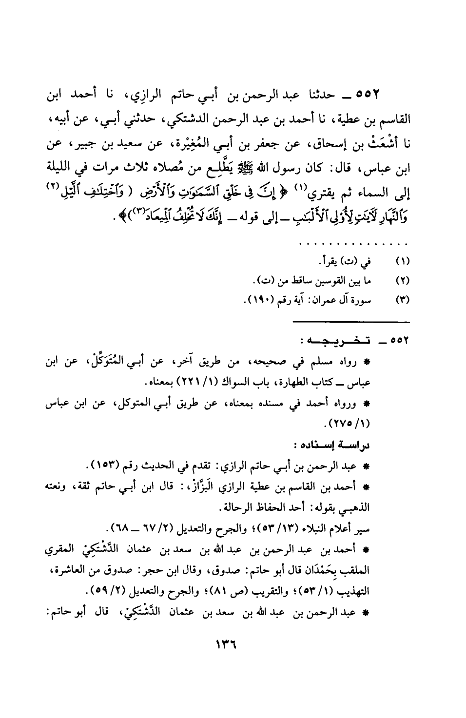 552 - حَدَّثَنَا عَبْدُ الرَّحْمَنِ بْنُ أَبِي حَاتِمٍ الرَّازِيُّ، نَا أَحْمَدُ بْنُ الْقَاسِمِ بْنِ عَطِيَّةَ، نَا أَحْمَدُ بْنُ عَبْدِ الرَّحْمَنِ الدَّشْتَكِيُّ، حَدَّثَنِي أَبِي، عَنْ أَبِيهِ، نَا أَشْعَثُ بْنُ إِسْحَاقَ، عَنْ جَعْفَرِ بْنِ أَبِي الْمُغِيرَةِ، عَنْ سَعِيدِ بْنِ جُبَيْرٍ، عَنِ ابْنِ عَبَّاسٍ، قَالَ: كَانَ رَسُولُ اللَّهِ صَلَّى اللهُ عَلَيْهِ وَسَلَّمَ §يَطْلُعُ مِنْ مُصَلَّاهُ ثَلَاثَ مَرَّاتٍ فِي اللَّيْلَةِ إِلَى السَّمَاءِ يَقْتَرِيءُ {إِنَّ فِي خَلْقِ السَّمَوَاتِ وَالْأَرْضِ وَاخْتِلَافِ اللَّيْلِ وَالنَّهَارِ لَآيَاتٍ لِأُولِي الْأَلْبَابِ} إِلَى قَوْلِهِ: {إِنَّكَ لَا تُخْلِفُ الْمِيعَادَ} [آل عمران: 194]