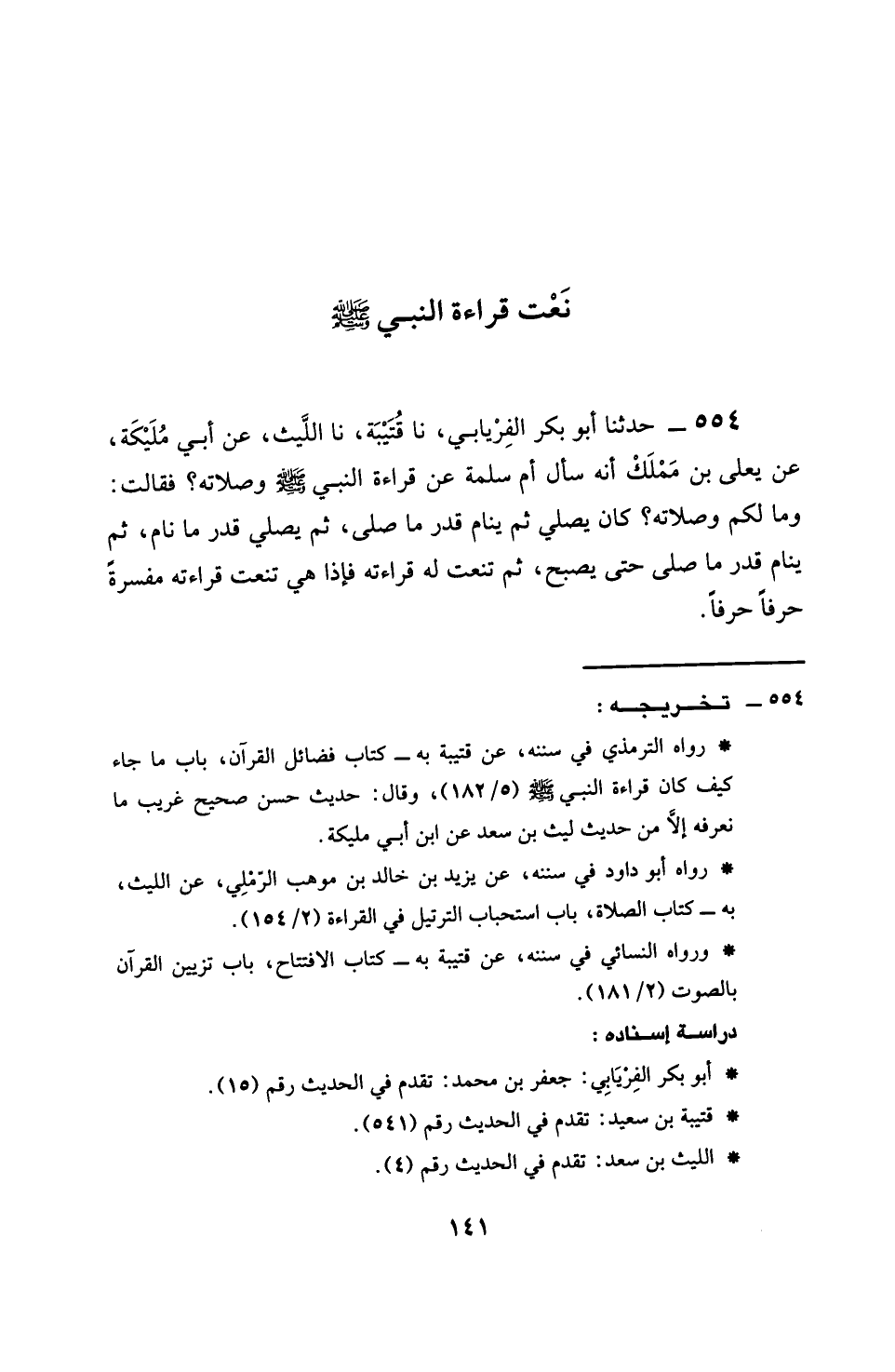 554 - حَدَّثَنَا أَبُو بَكْرٍ الْفِرْيَابِيُّ، نَا قُتَيْبَةُ، نَا اللَّيْثُ، عَنِ ابْنِ أَبِي مُلَيْكَةَ، عَنْ يَعْلَى بْنِ مَمْلَكٍ، أَنَّهُ سَأَلَ أُمَّ سَلَمَةَ عَنْ قِرَاءَةِ النَّبِيِّ، صَلَّى اللهُ عَلَيْهِ وَسَلَّمَ، وَصَلَاتِهِ؟ فَقَالَتْ: وَمَا لَكُمْ وَصَلَاتَهُ؟ كَانَ §يُصَلِّي، ثُمَّ يَنَامُ قَدْرَ مَا صَلَّى، ثُمَّ يُصَلِّي قَدْرَ مَا نَامَ، ثُمَّ يَنَامُ قَدْرَ مَا صَلَّى، حَتَّى يُصْبِحُ، ثُمَّ تَنْعِتُ لَهُ قِرَاءَتَهُ، فَإِذَا هِيَ تَنْعِتُ قِرَاءَتَهُ مُفَسَّرَةً حَرْفًا حَرْفًا