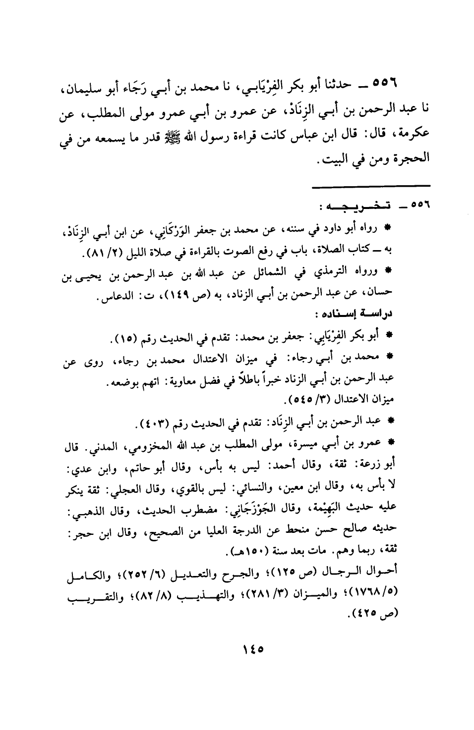 557 - حَدَّثَنَا أَبُو بَكْرٍ الْفِرْيَابِيُّ، نَا مُحَمَّدُ بْنُ أَبِي رَجَاءٍ أَبُو سُلَيْمَانَ، نَا عَبْدُ الرَّحْمَنِ بْنُ أَبِي الزِّنَادِ، عَنْ عَمْرِو بْنِ أَبِي عَمْرٍو، مَوْلَى الْمُطَّلِبِ، عَنْ عِكْرِمَةَ، قَالَ: قَالَ ابْنُ عَبَّاسٍ: §كَانَتْ قِرَاءَةُ رَسُولَ اللَّهِ صَلَّى اللهُ عَلَيْهِ وَسَلَّمَ قَدْرَ مَا يَسْمَعُهُ مَنْ فِي الْحُجْرَةِ، وَمَنْ فِي الْبَيْتِ. حَدَّثَنَا حَامِدُ بْنُ شُعَيْبٍ، نَا ابْنُ بَكَّارٍ، نَا ابْنُ أَبِي الزِّنَادِ، مِثْلَهُ