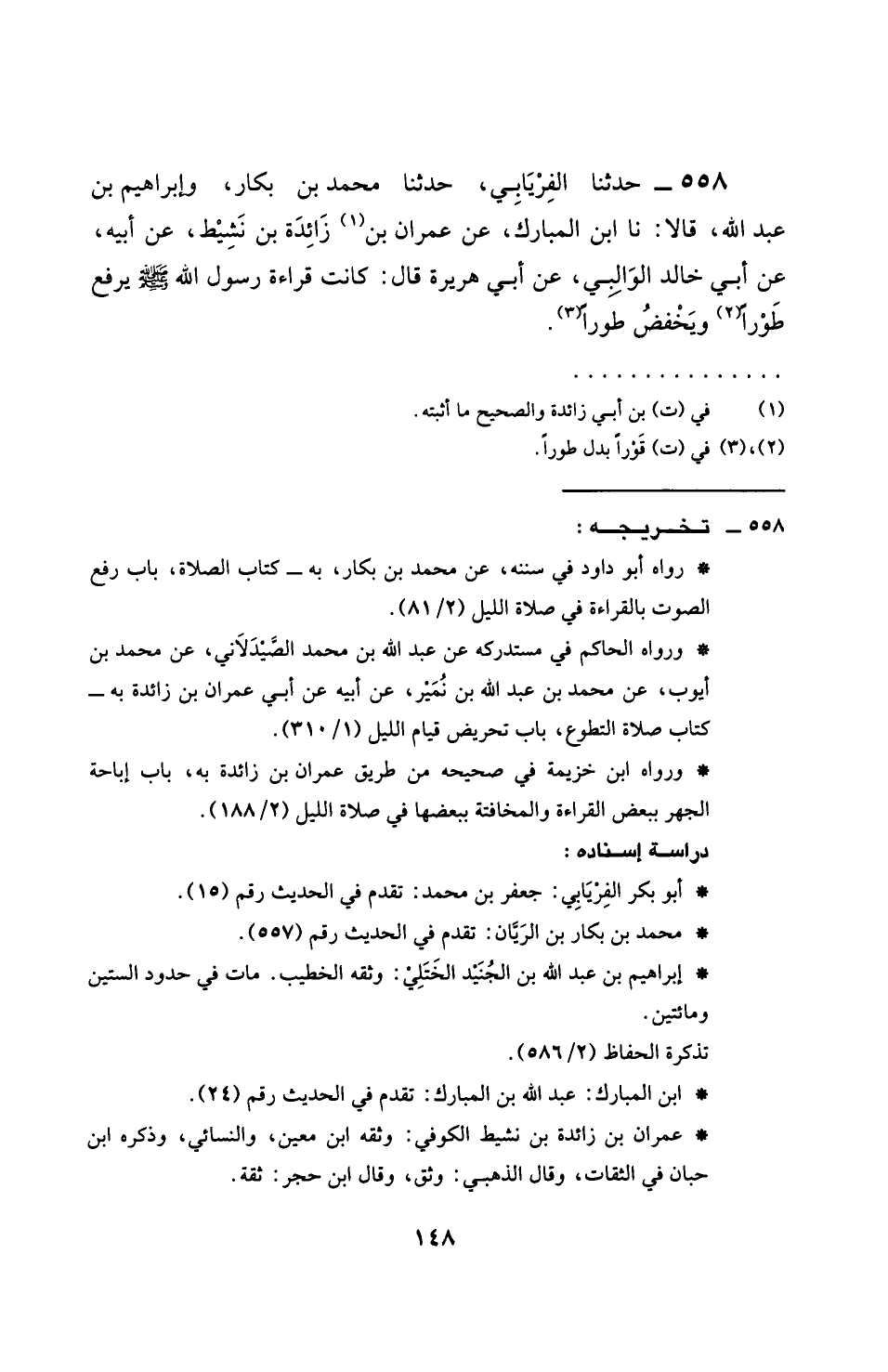 558 - حَدَّثَنَا الْفِرْيَابِيُّ، نَا مُحَمَّدُ بْنُ بَكَّارٍ، وَإِبْرَاهِيمُ بْنُ عَبْدِ اللَّهِ، قَالَا: أنا ابْنُ الْمُبَارَكِ، عَنْ عِمْرَانَ بْنِ زَائِدَةَ بْنِ نَشِيطٍ، عَنْ أَبِيهِ، عَنْ أَبِي خَالِدٍ الْوَالِبِيُّ، عَنْ أَبِي هُرَيْرَةَ، قَالَ: §كَانَتْ قِرَاءَةُ رَسُولَ اللَّهِ صَلَّى اللهُ عَلَيْهِ وَسَلَّمَ بِاللَّيْلِ: يَرْفَعُ طَوْرًا، وَيَخْفِضُ طَوْرًا