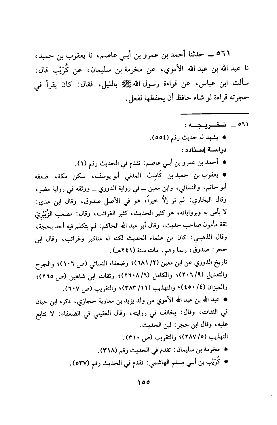 561 - حَدَّثَنَا أَحْمَدُ بْنُ عَمْرِو بْنِ أَبِي عَاصِمٍ، نَا يَعْقُوبُ بْنُ حُمَيْدٍ، نَا عَبْدُ اللَّهِ بْنُ عَبْدِ اللَّهِ الْأُمَوِيُّ، عَنْ مَخْرَمَةَ بْنِ سُلَيْمَانَ، عَنْ كُرَيْبٍ، قَالَ: سَأَلْتُ ابْنَ عَبَّاسٍ عَنْ قِرَاءَةِ رَسُولِ اللَّهِ صَلَّى اللهُ عَلَيْهِ وَسَلَّمَ بِاللَّيْلِ؟ فَقَالَ: كَانَ §يَقْرَأُ فِي حُجْرَتِهِ قِرَاءَةً، لَوْ شَاءَ حَافَظٌ أَنْ يَحْفَظَهَا لَفَعَلَ