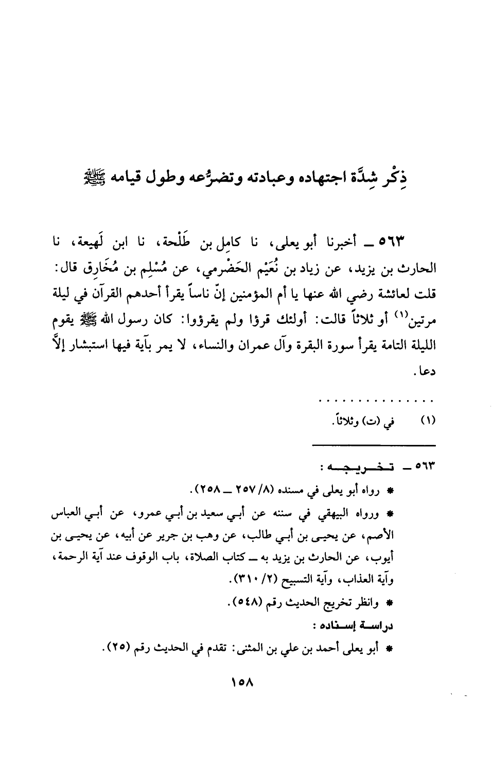 563 - أَخْبَرَنَا أَبُو يَعْلَى، نَا كَامِلُ بْنُ طَلْحَةَ، نَا ابْنُ لَهِيعَةَ، نَا الْحَارِثُ بْنُ يَزِيدَ، عَنْ زِيَادِ بْنِ نُعَيْمٍ الْحَضْرَمِيِّ، عَنْ مُسْلِمِ بْنِ مُخَارِقٍ، قَالَ: قُلْتُ لِعَائِشَةَ رَضِيَ اللَّهُ عَنْهَا: يَا أُمَّ الْمُؤْمِنِينَ إِنَّ نَاسًا يَقْرَأُ أَحَدُهُمُ الْقُرْآنَ فِي لَيْلَةٍ مَرَّتَيْنٍ، أَوْ ثَلَاثًا، قَالَتْ: أُولَئِكَ قَرَأُوا وَلَمْ يَقْرَءُوا، كَانَ رَسُولُ اللَّهِ صَلَّى اللهُ عَلَيْهِ وَسَلَّمَ §يَقُومُ اللَّيْلَةَ التَّامَّةَ يَقْرَأُ سُورَةَ الْبَقَرَةِ وَآل عِمْرَانَ وَالنِّسَاءَ، لَا يَمُرُّ بِآيَةٍ فِيهَا اسْتِبْشَارٌ إِلَّا دَعَا