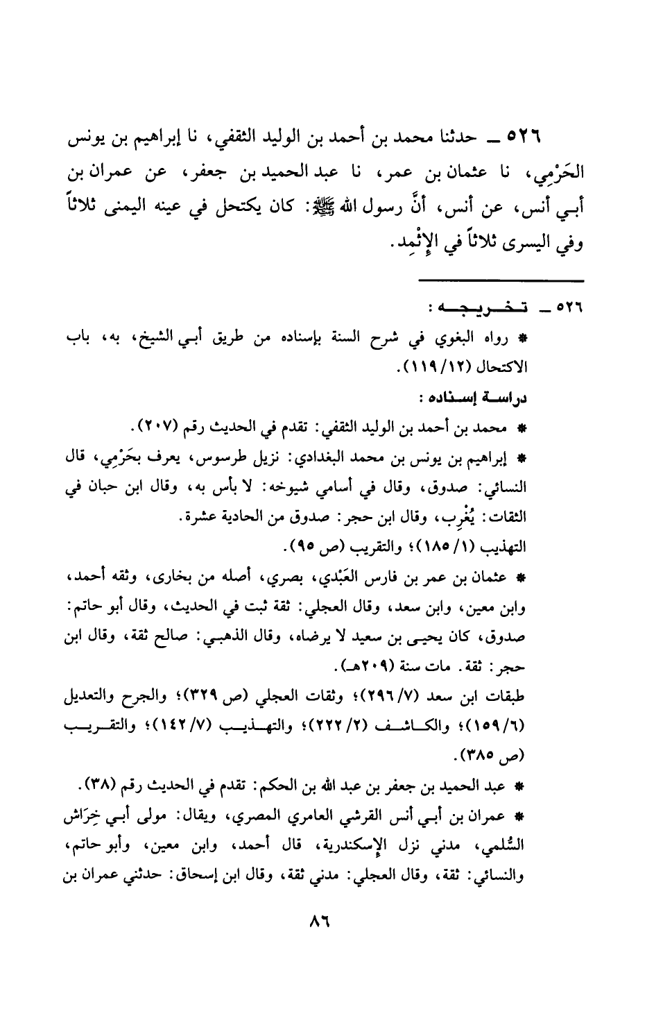 526 - حَدَّثَنَا مُحَمَّدُ بْنُ أَحْمَدَ بْنِ الْوَلِيدِ الثَّقَفِيُّ، نَا إِبْرَاهِيمُ بْنُ يُونُسَ الْحَرَمِيُّ، نَا عُثْمَانُ بْنُ عُمَرَ، نَا عَبْدُ الْحَمِيدِ بْنُ جَعْفَرٍ، عَنْ عِمْرَانَ بْنِ أَبِي أَنَسٍ، عَنْ أَنَسٍ، §أَنَّ رَسُولُ اللَّهِ صَلَّى اللهُ عَلَيْهِ وَسَلَّمَ كَانَ يَكْتَحِلُ فِي عَيْنِهِ الْيُمْنَى ثَلَاثًا، وَفَى الْيُسْرَى ثَلَاثًا بِالْإِثْمِدِ