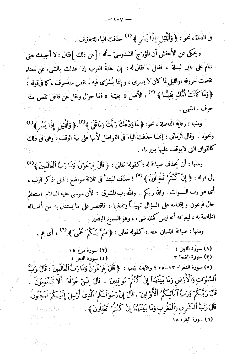 في الصلة، نحو: {والليل إذا يسر} حُذِفَتِ الْيَاءُ لِلتَّخْفِيفِ.