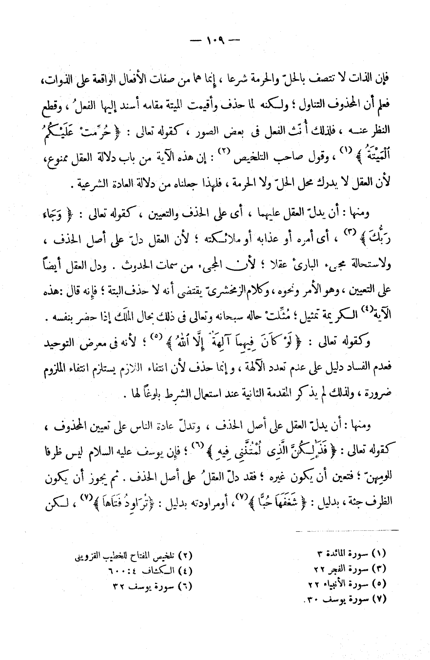 فَإِنَّ الذَّاتَ لَا تَتَّصِفُ بِالْحِلِّ وَالْحُرْمَةِ شَرْعًا إِنَّمَا هُمَا مِنْ صِفَاتِ الْأَفْعَالِ الْوَاقِعَةِ عَلَى الذَّوَاتِ فَعُلِمَ أَنَّ الْمَحْذُوفَ التَّنَاوُلُ وَلَكِنَّهُ لَمَّا حُذِفَ وَأُقِيمَتِ الْمَيْتَةُ مَقَامَهُ أُسْنِدَ إِلَيْهَا الْفِعْلُ وَقُطِعَ النَّظَرُ عَنْهُ فَلِذَلِكَ أُنِّثَ الْفِعْلُ فِي بَعْضِ الصُّوَرِ كَقَوْلِهِ تَعَالَى: {حُرِّمَتْ عَلَيْكُمُ الْمَيْتَةُ} وَقَوْلُ صَاحِبِ التَّلْخِيصِ: إِنَّ هَذِهِ الْآيَةَ مِنْ بَابِ دَلَالَةِ الْعَقْلِ مَمْنُوعٌ لِأَنَّ الْعَقْلَ لَا يُدْرِكُ مَحَلَّ الْحِلِّ وَلَا الْحُرْمَةِ فَلِهَذَا جَعَلْنَاهُ مِنْ دَلَالَةِ الْعَادَةِ الشَّرْعِيَّةِ.