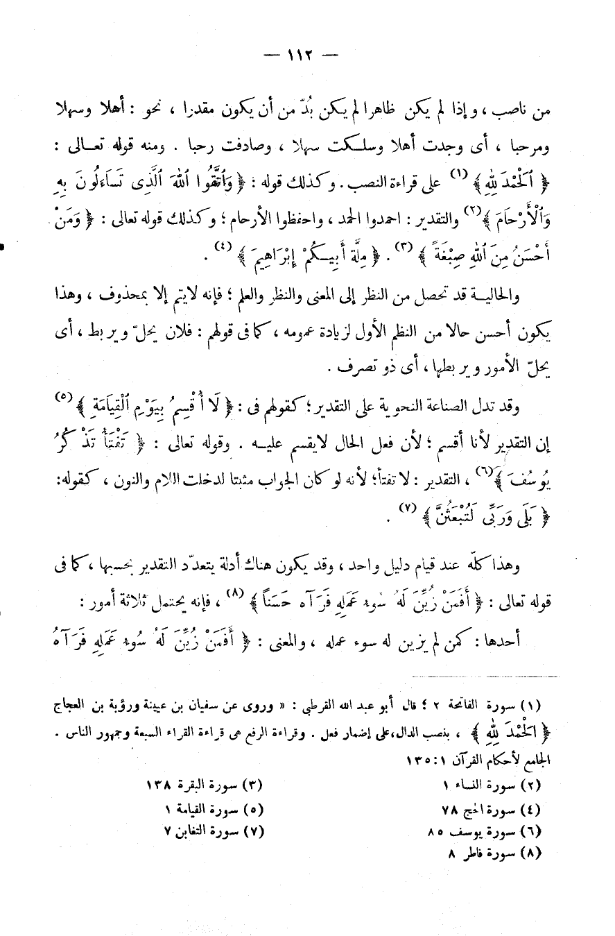 مِنْ نَاصِبٍ وَإِذَا لَمْ يَكُنْ ظَاهِرًا لَمْ يَكُنْ بُدٌّ مِنْ أَنْ يَكُونَ مُقَدَّرًا نَحْوَ: أَهْلًا وَسَهْلًا وَمَرْحَبًا أَيْ وُجِدْتَ أَهْلًا وَسَلَكْتَ سَهْلًا وَصَادَفْتَ رَحْبًا. وَمِنْهُ قَوْلُهُ تَعَالَى: {الْحَمْدُ لله} عَلَى قِرَاءَةِ النَّصْبِ. وَكَذَلِكَ قَوْلُهُ: {وَاتَّقُوا اللَّهَ الذي تساءلون به والأرحام} وَالتَّقْدِيرُ: احْمِدُوا الْحَمْدَ وَاحْفَظُوا الْأَرْحَامَ، وَكَذَلِكَ قَوْلُهُ تعالى: {ومن أحسن من الله صبغة} . {ملة أبيكم إبراهيم} .