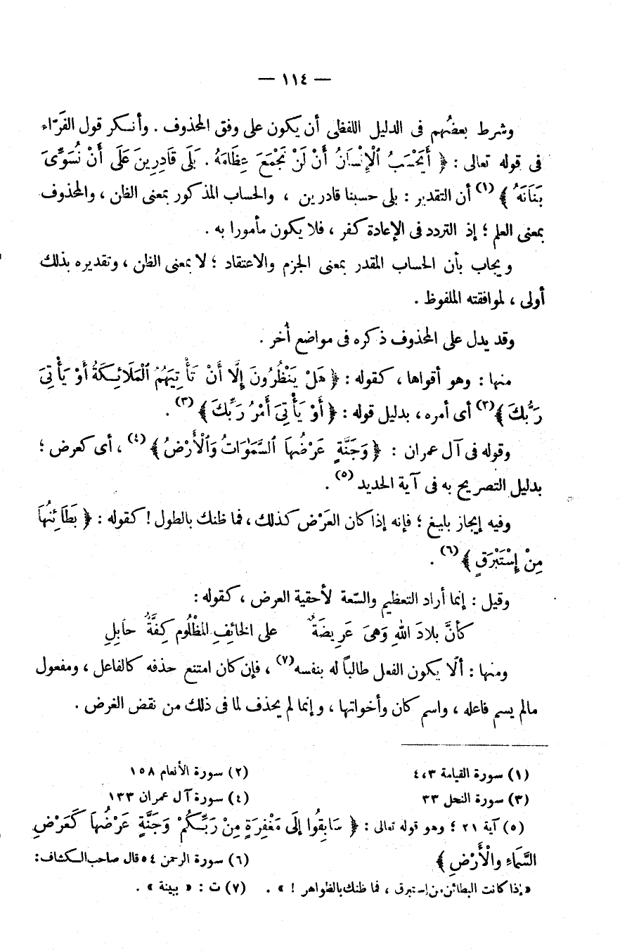وَشَرَطَ بَعْضُهُمْ فِي الدَّلِيلِ اللَّفْظِيِّ أَنْ يَكُونَ عَلَى وَفْقِ الْمَحْذُوفِ. وَأُنْكِرَ قَوْلُ الْفَرَّاءِ فِي قَوْلِهِ تَعَالَى: {أَيَحْسَبُ الْإِنْسَانُ أَلَّنْ نَجْمَعَ عِظَامَهُ. بلى قادرين على أن نسوي بنانه} أَنَّ التَّقْدِيرَ: بَلَى حَسِبَنَا قَادِرِينَ وَالْحِسَابُ الْمَذْكُورُ بِمَعْنَى الظَّنِّ وَالْمَحْذُوفُ بِمَعْنَى الْعِلْمِ إِذِ التَّرَدُّدُ فِي الْإِعَادَةِ كُفْرٌ فَلَا يَكُونُ مَأْمُورًا بِهِ.