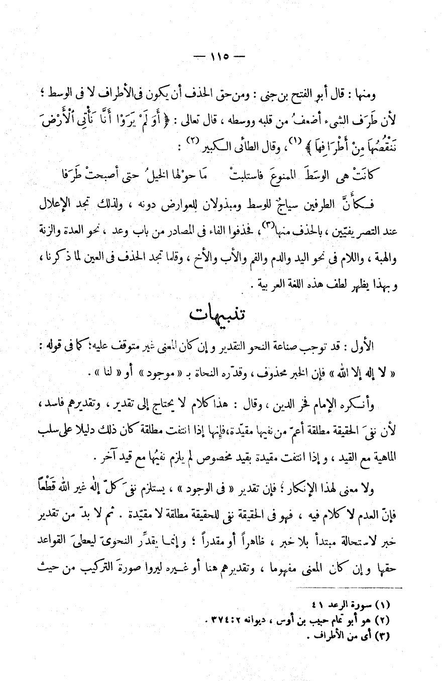 وَمِنْهَا: قَالَ أَبُو الْفَتْحِ بْنُ جِنِّي وَمِنْ حَقِّ الْحَذْفِ أَنْ يَكُونَ فِي الْأَطْرَافِ لَا فِي الْوَسَطِ لِأَنَّ طَرَفَ الشَّيْءِ أَضْعَفُ مِنْ قَلْبِهِ وَوَسَطِهِ، قَالَ تَعَالَى: {أَوَلَمْ يَرَوْا أَنَّا نأتي الأرض ننقصها من أطرافها} وَقَالَ الطَّائِيُّ الْكَبِيرُ: