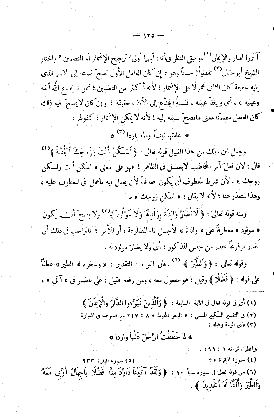 وَمِنْهُ قَوْلُهُ تَعَالَى: {لَا تضار والدة بولدها ولا مولود} وَلَا يَصِحُّ أَنْ يَكُونَ [مَوْلُودٌ] مَعْطُوفًا عَلَى [وَالِدَةٌ] لِأَجْلِ تَاءِ الْمُضَارَعَةِ أَوْ لِلْأَمْرِ فَالْوَاجِبُ فِي ذَلِكَ أَنْ تُقَدِّرَ مَرْفُوعًا بِمُقَدَّرٍ مِنْ جِنْسِ الْمَذْكُورِ أَيْ وَلَا يُضَارُّ مَوْلُودٌ لَهُ.