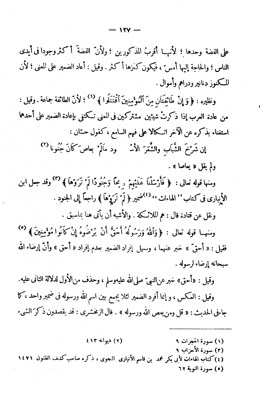 وَنَظِيرُهُ: {وَإِنْ طَائِفَتَانِ مِنَ الْمُؤْمِنِينَ اقتتلوا} ،لِأَنَّ الطَّائِفَةَ جَمَاعَةٌ. وَقِيلَ: مِنْ عَادَةِ الْعَرَبِ إِذَا ذَكَرَتْ شَيْئَيْنِ مُشْتَرِكَيْنِ فِي الْمَعْنَى تَكْتَفِي بِإِعَادَةِ الضَّمِيرِ عَلَى أَحَدِهِمَا اسْتِغْنَاءً بِذِكْرِهِ عَنِ الْآخَرِ اتِّكَالًا عَلَى فَهْمِ السَّامِعِ كَقَوْلِ حَسَّانِ: