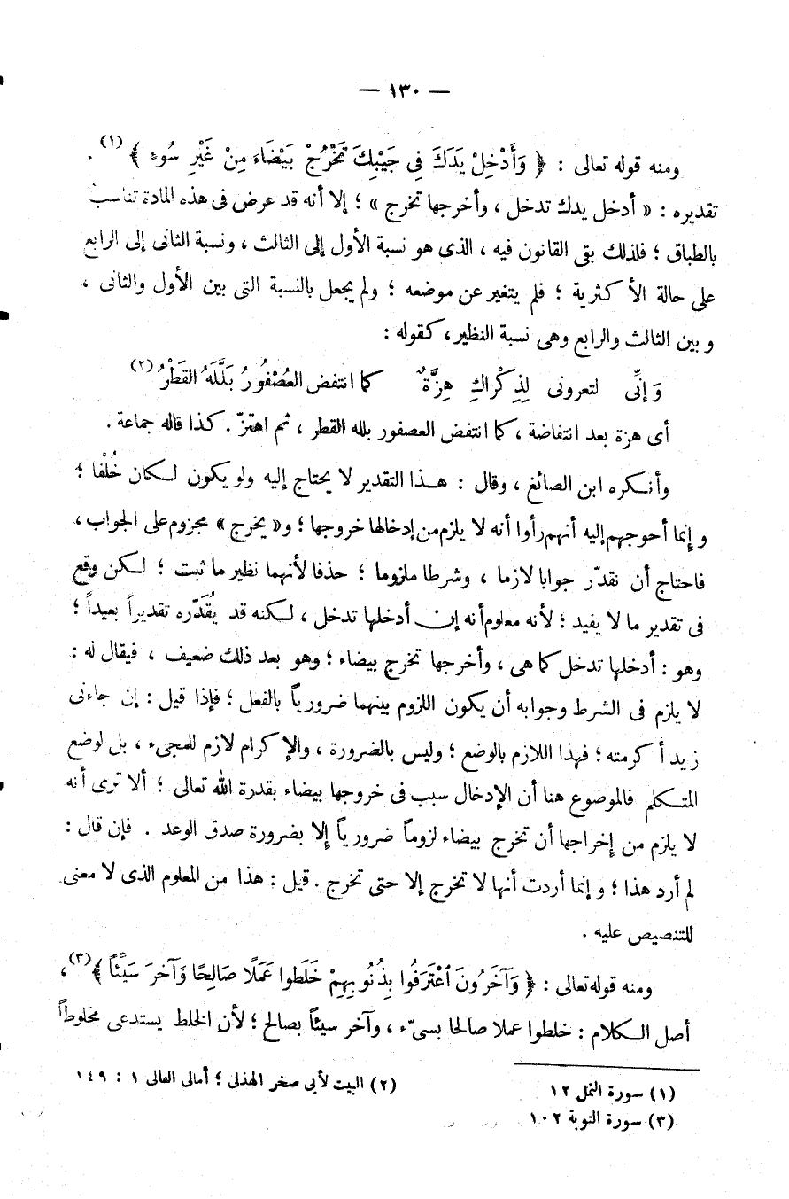 وَمِنْهُ قَوْلُهُ تَعَالَى: {وَأَدْخِلْ يَدَكَ فِي جَيْبِكَ تخرج بيضاء من غير سوء} ، تَقْدِيرُهُ: [أَدْخِلْ يَدَكَ تَدْخُلُ وَأَخْرِجْهَا تَخْرُجُ] ، إِلَّا أَنَّهُ قَدْ عَرَضَ فِي هَذِهِ الْمَادَّةِ تَنَاسُبٌ بِالطِّبَاقِ فَلِذَلِكَ بَقِيَ الْقَانُونُ فِيهِ الَّذِي هُوَ نِسْبَةُ الْأَوَّلِ إِلَى الثَّالِثِ وَنِسْبَةُ الثَّانِي إِلَى الرابع علىحالة الْأَكْثَرِيَّةِ فَلَمْ يَتَغَيَّرْ عَنْ مَوْضِعِهِ وَلَمْ يُجْعَلْ بِالنِّسْبَةِ الَّتِي بَيْنَ الْأَوَّلِ وَالثَّانِي وَبَيْنَ الثَّالِثِ وَالرَّابِعِ وَهِيَ نِسْبَةُ النَّظِيرِ كَقَوْلِهِ: