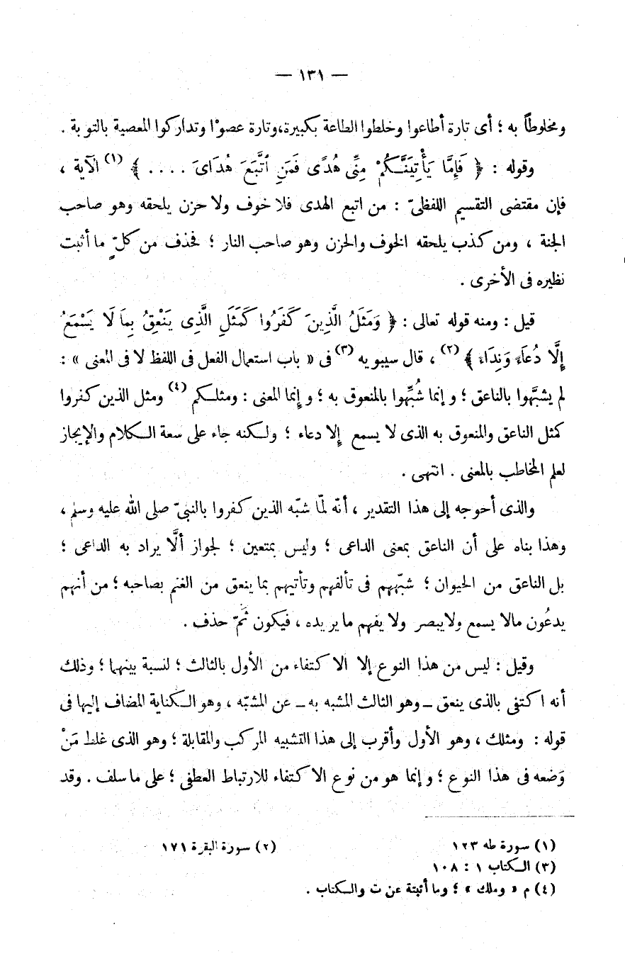 قِيلَ: وَمِنْهُ قَوْلِهِ تَعَالَى: {وَمَثَلُ الَّذِينَ كَفَرُوا كَمَثَلِ الَّذِي يَنْعِقُ بما لا يسمع إلا دعاء} ،قَالَ سِيبَوَيْهِ [فِي بَابِ اسْتِعْمَالِ الْفِعْلِ فِي اللَّفْظِ لَا فِي الْمَعْنَى] : لَمْ يُشَبَّهُوا بِالنَّاعِقِ وَإِنَّمَا شُبِّهُوا بِالْمَنْعُوقِ بِهِ وَإِنَّمَا الْمَعْنَى: وَمَثَلُكُمْ وَمَثَلُ الَّذِينَ كَفَرُوا كَمَثَلِ النَّاعِقِ وَالْمَنْعُوقِ بِهِ الَّذِي لَا يَسْمَعُ إِلَّا دُعَاءً وَلَكِنَّهُ جَاءَ عَلَى سِعَةِ الْكَلَامِ وَالْإِيجَازِ لِعِلْمِ الْمُخَاطَبِ بِالْمَعْنَى. انْتَهَى.